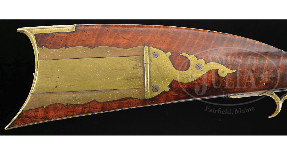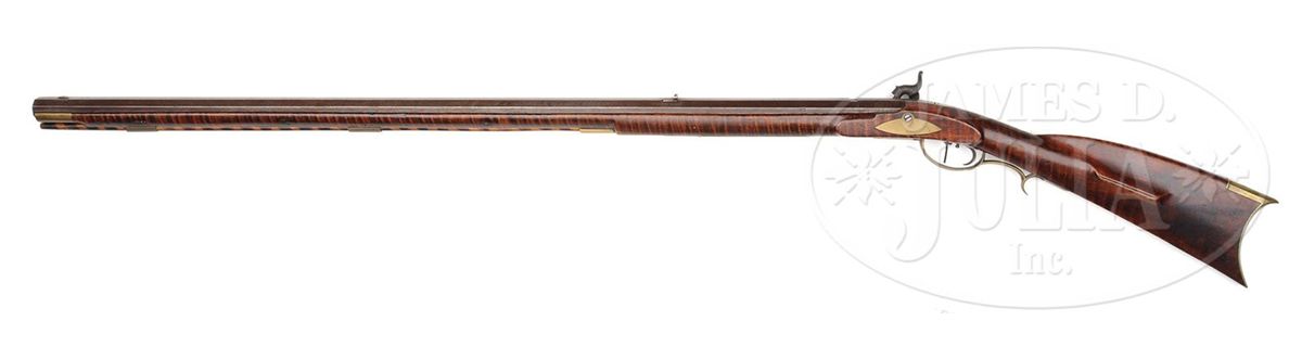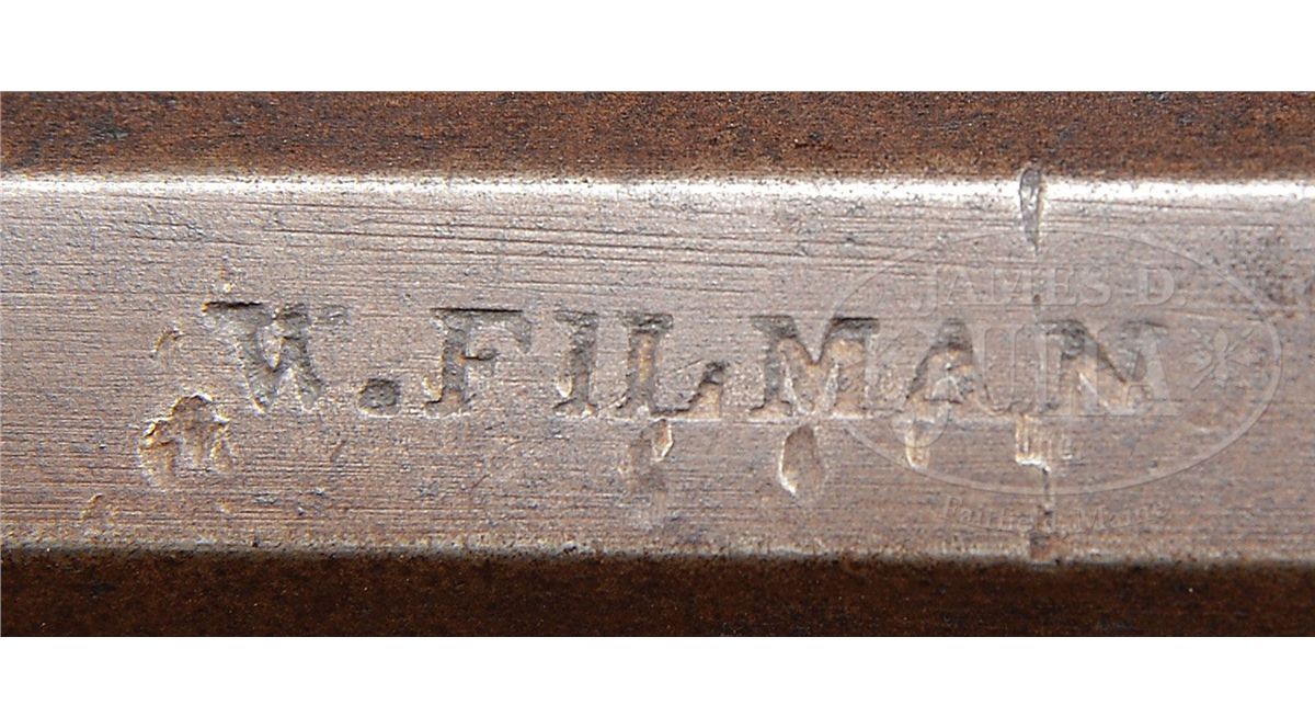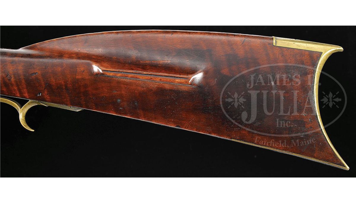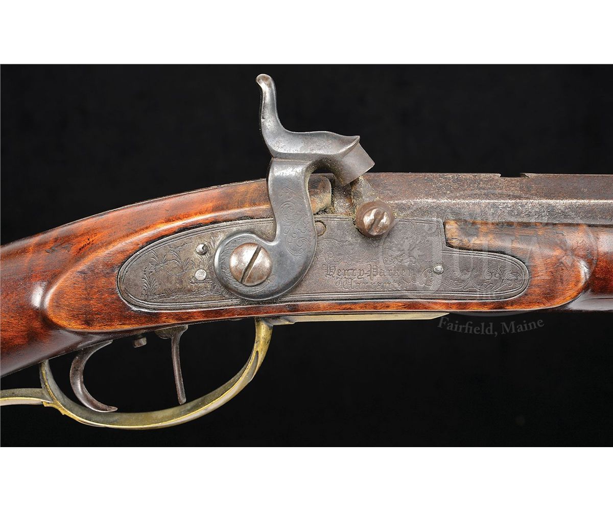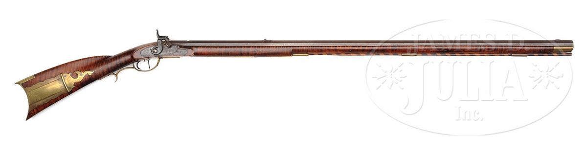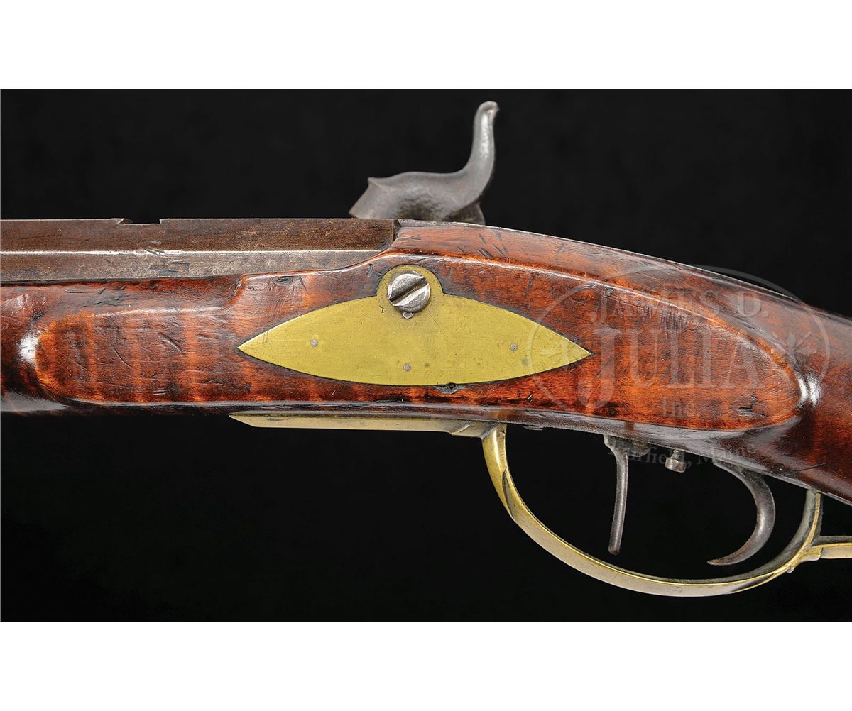NSN. 38" full oct 45 Cal. rifled bbl stamped "W. Filman". Stock is nice featured curly maple throughout. Brass sideplate is football shaped and there is 4-3/4" brass saddleplate as is common on upper Susquehannah rifles. Four piece brass patch box has a whale's tail finial and is not engraved. Lock is signed "Henry Parker Warranted", Parker made locks in Trenton, NJ. Rifle has double set triggers. CONDITION: Gun is in nice original unrestored and unrepaired condition throughout. Bbl has one slot 7-1/2" rear of the sight where another sight had at one time been positioned. 4-48895 RG69