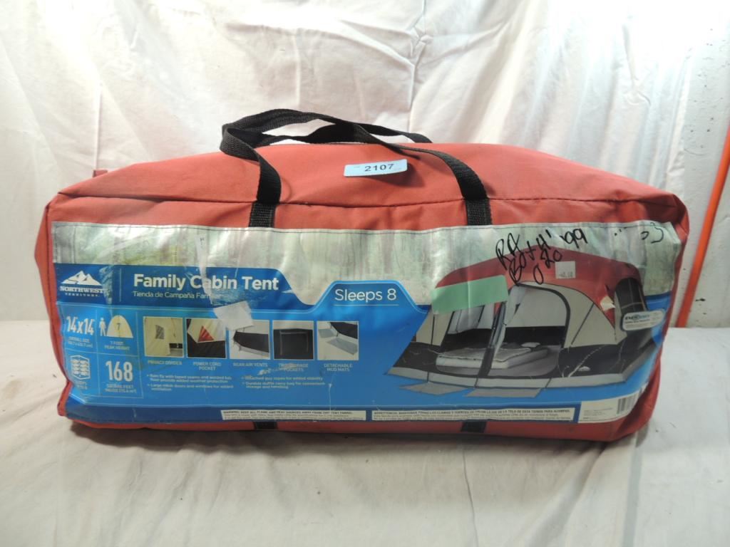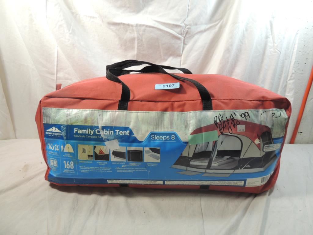 SLEEPS 8 14X14, 7 FOOT PEAK HEIGHT, SLEEPS 8 168 SQUARE FEET, PRIVACY DIVIDER, POWER CORD POCKET, REAR AIR VENTS, TWO STORAGE POCKETS, DETACHABLE MUD MATS AS SHOWN SEE PHOTO FOR MORE DETAILS.