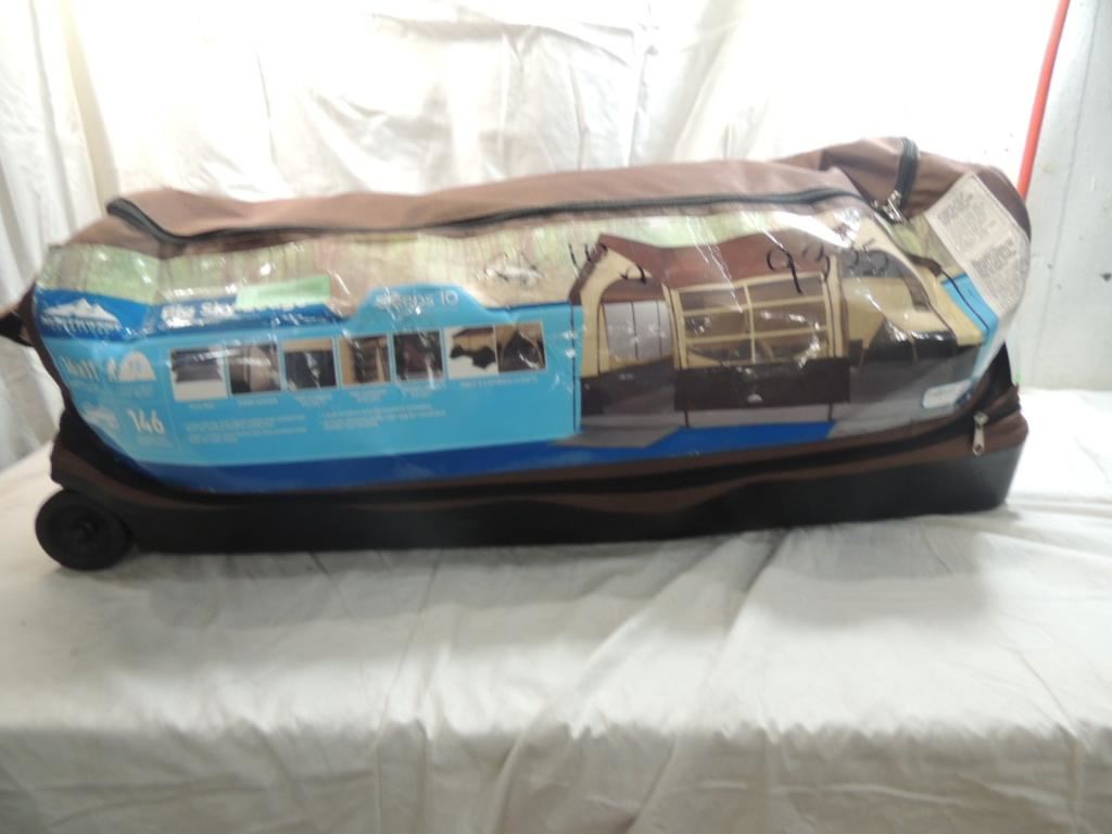 SLEEPS 10 16X11 OVERALL SIZE, 7 FOOT 2 INCH PEAK HEIGHT, SLEEPS UP TO 10, MUD MAT, ROOM DIVIDER, TOW STRAGE POCKETS, TWO HANGING SHELVES, POER CORD POCKET, TWO 3X3 STORAGE CLOSETS, LARGE RAIN FLY WITH TAPED SEAMS AND WELDED TUB FLOOR FOR ADDED WEATHER PROTECTION, BAG WITH WHEELS, LARGE WINDOWS, DELUXE TENT AS SHOWN SEE PHOTO FOR MORE DETAILS.