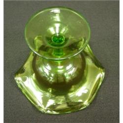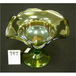 Northwood flower compote. Green. Marked N in circle inside. Crimped bowl. Subtle iridescence. 4-5/8" tall, 5-1/2" wide at top. Condition: Excellent