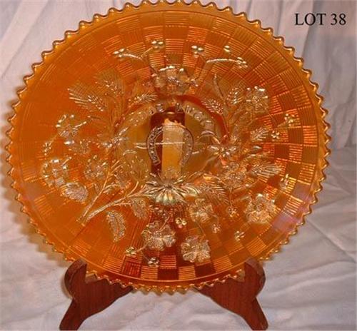 NORTHMORE CARNIVAL CAKE DISH, "GOOD LUCK," W/ HORSESHOE CENTER, FLORAL & WHEAT BASKET WEAVE - 9" DIA., WEIGHING 0.6 LB.