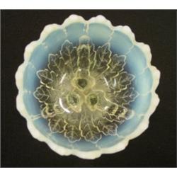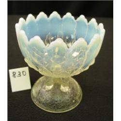 Northwood opalescent "Hilltop Vines" compote. Overlapping leaf form bowl; 3-part branch stem on domed, pimpled base. Not a reproduction! 4.5" across top, 5" tall. Condition: One leaf tip feels rough, but no chips, cracks or other damage.
