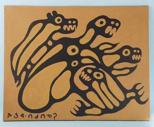 NORVAL MORRISSEAU - Contemporary Canadian Native school. "Bear with Spirit." Acrylic on canvas. Signed lower left. Signed and dated '71 and stamped on reverse. 31 1/2" x 39 1/2". 3000-4000