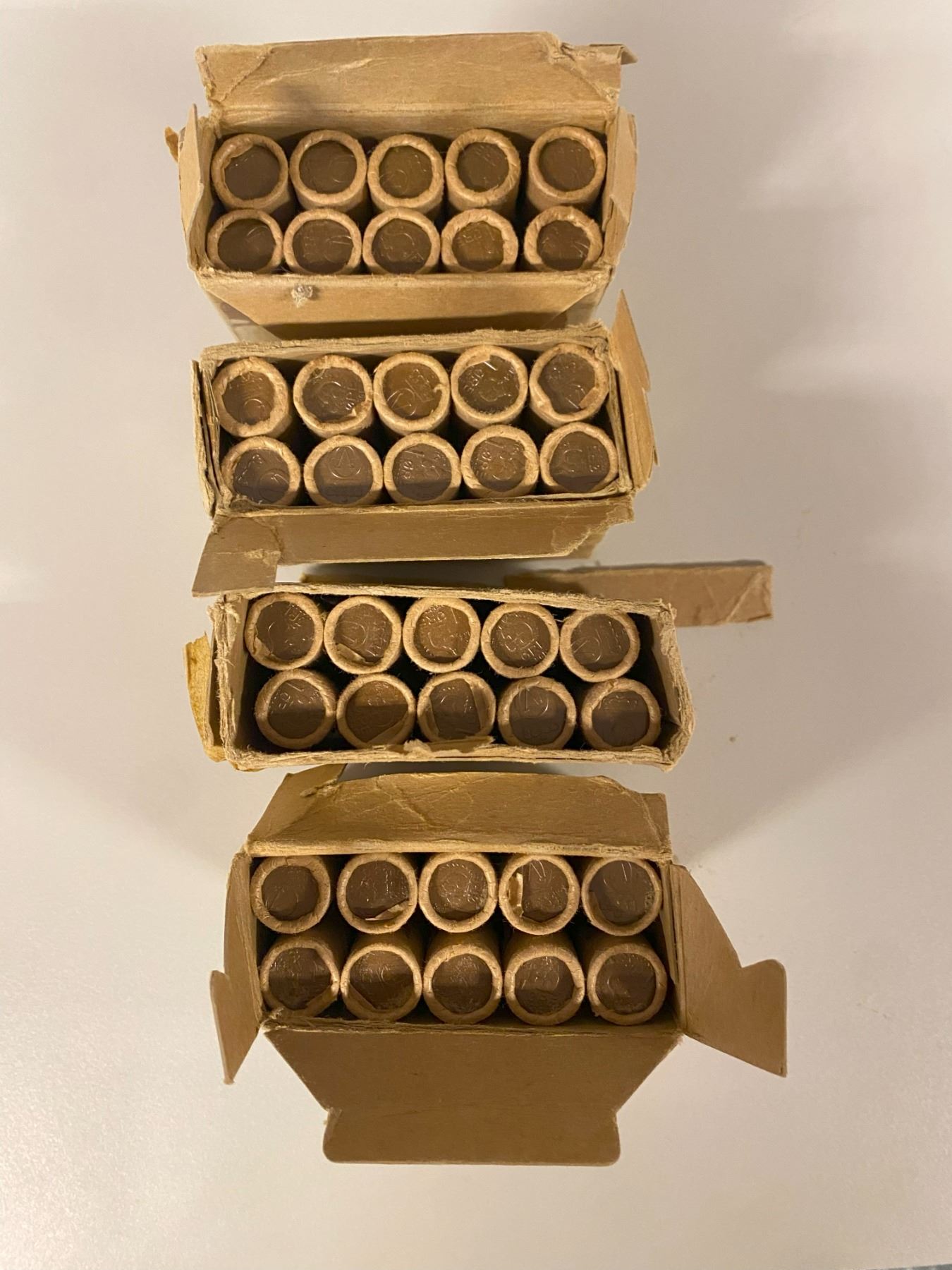 NORWAY: LOT of 2000 coins, all 1964 1 øre (KM-403, squirrel) coins in original bank wrappers, 500 pcs per original bank boxes (4 boxes), boxes are showing much wear, but all coins appear to be Choice Brown Unc.; retail value $1500, lot of 2000 pieces.