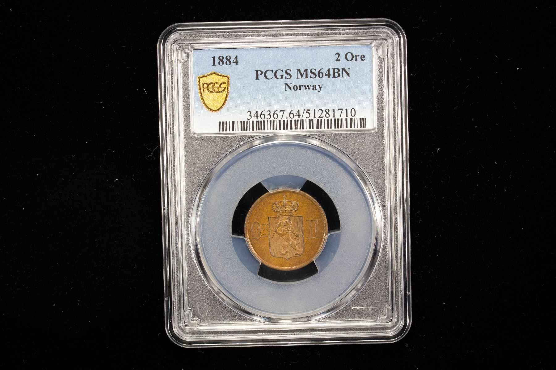 NORWAY: Oscar II, 1872-1905, AE 2 ore, 1884, PCGS MS64 BN