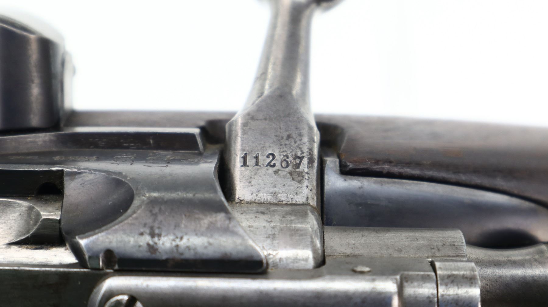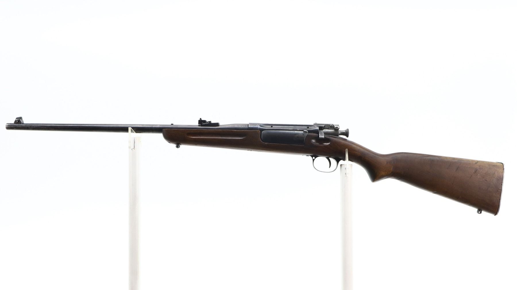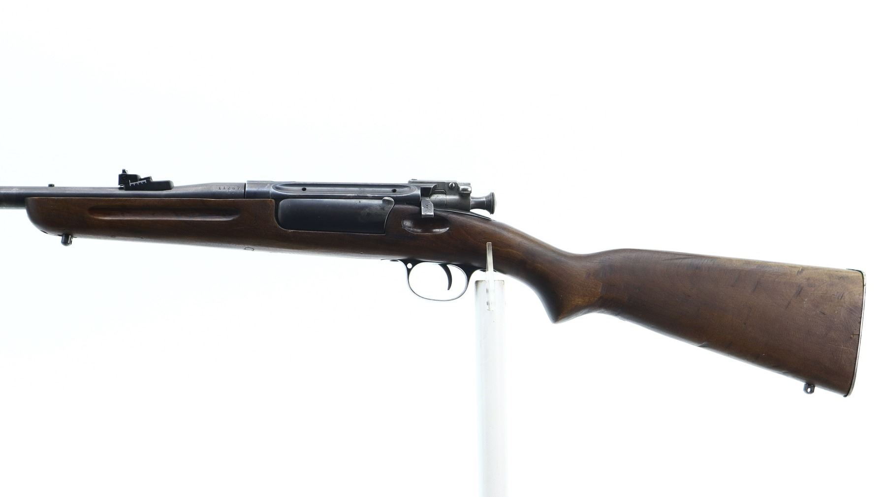 4/10, NORWEGIAN KRAG, MODEL: 1912 SPORTER, CALIBER: 6.5 X 55, BORE IS FAIR, WORN, PITTED. BOLT MATCHES. BLADE FRONT SIGHT WITH RAMP, REPLACED ADJUSTABLE U NOTCHED REAR SIGHT, SILVER BOLT WITH STRAIGHT HANDLE, LEFT SIDE OF RECEIVER DRILLED AND TAPPED FOR SCOPE MOUNT. ONE PIECE SPORTERIZED WOOD STOCK, FINGER GROOVED FOREND, PISTOL GRIP, SMOOTH STEEL BUTT PLATE, SWIVEL STUDS. METAL FINISH SHOWS SCRATCHES, HANDLING MARKS AND WEAR. STOCK SHOWS MARKS, SCRATCHES AND FINISH WEAR. , ACTION: BOLT ACTION RIFLE, BARREL LENGTH: 20.5", SERIAL# 11267, CONDITION: 4/10, CLASS: CANADIAN NON RESTRICTED