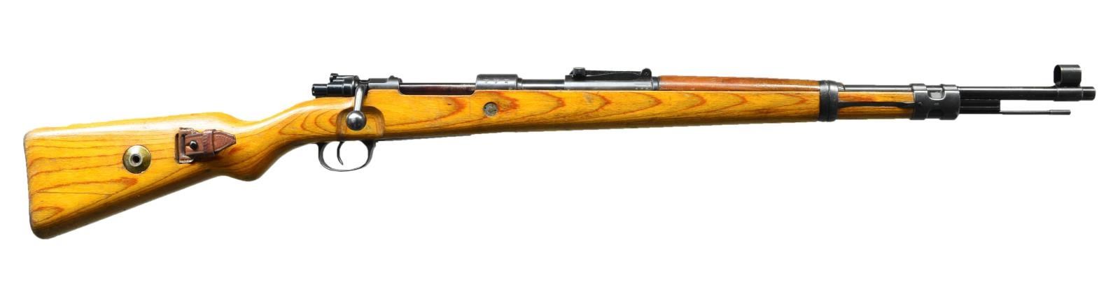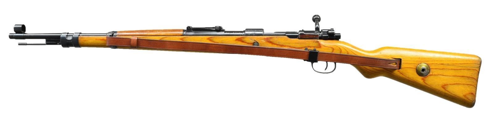 Cal. 30-06 S# HAER-64789. Bbl. 23 1/2" w/ import mark. Bolt handle and buttplate match, other parts are mismatched. Receiver top marked "42" denoting Mauser Oberndorf manufacture and 1939 date. Top left of receiver is marked "HAER-64789" denoting post-war Norwegian army use. Receiver also retains original Nazi S #3075d, which matches floorplate & triggerguard original S'#s. Tangent rear sight graduated to 2000m. Hooded blade front sight. Cleaning rod & bayonet lug present. Provision for side sling w/ repro brown leather sling. Flat steel buttplate. Laminated stock. CONDITION: stock has arsenal rework finish w/ scattered handling marks & dings. Metal retains 90% arsenal rework blue with some silvering on the high edges & scattered light oxidation on floorplate. Excellent bright bore. (22-2626/MJC). CURIO. $600-800.