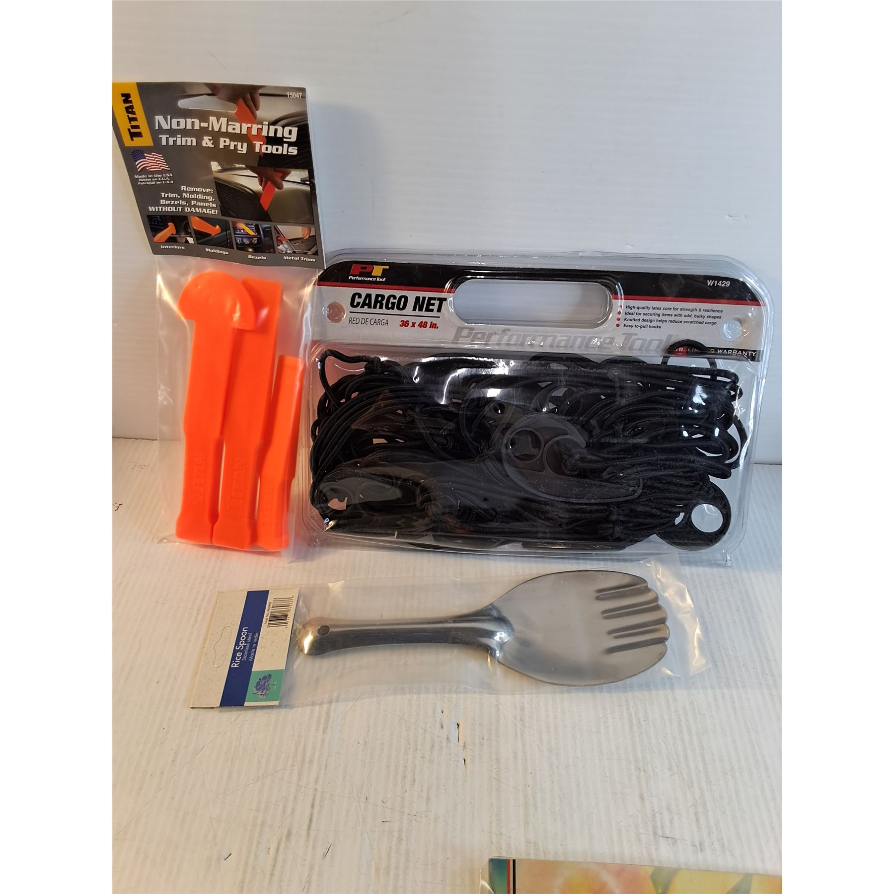 NOS Cargo Net,Flashlight,Socket Adapter,Cable Ties and more in pictures