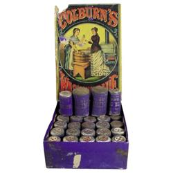 NOS Colburn's Washing Blue bluing box w/33 cdbd. & tin containers of Colburn's Bluing, early 1900's, box is 6.5"W x 10"H.