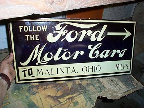 FOLLOW THE FORD MOTOR CARS TO MALINTA, OHIO. TIN SIGN- ONE SIGNED. BLACK AND CREAM. NOS AND NEVER BEEN HUNG. SEPERATED BY TISSUE PAPER- SOME PAPER STICKS TO SIGN. SOME CONDITION ISSUES- GOOD BUT NOT PERFECT.
