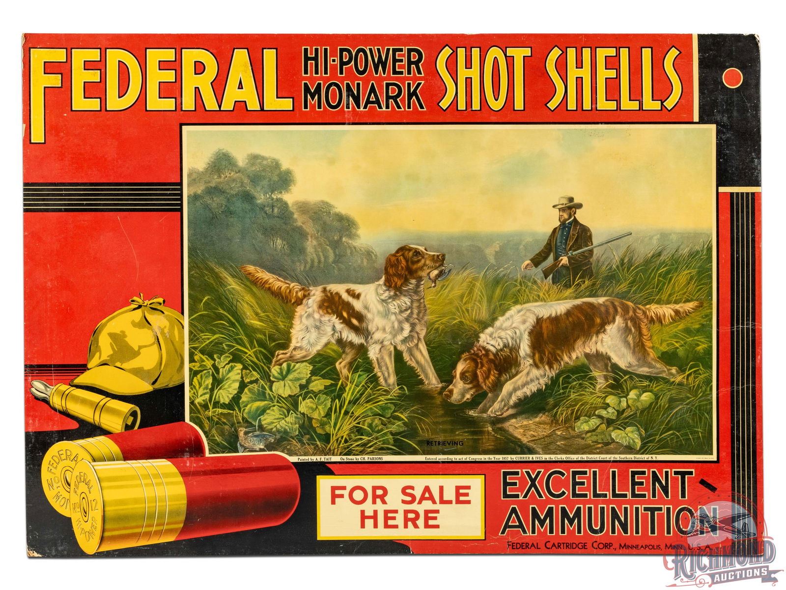 NOS (new old stock) Federal Ammunition cardboard easel back sign with excellent color and a great bird dog hunting scene, "Retrieving", by A.F. Tait. Sign has storage and age related wear including large creases along the right and bottom. The surface has spotting and discoloration with an area of wear in the left hat. Edges and corner present with additional wear. Original cardboard box is worn and has evidence of water damage. Marked Painted by A.F. Tait, On Stone by CH Parsons, Entered according to act of Congress in the Year of 1857 by Currier & Ives in the Clerks Office of the District Court of the Southern District of NY, B&B St. Paul, USA. 26.5" H x 37.25" W.