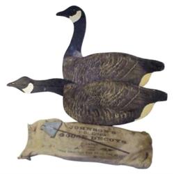 NOS Johnson's Folding Goose Decoys, complete set of 12 cdbd. decoys w/orig. metal stands & canvas advertising bag, VG condition.