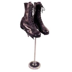 NOS child's hightop laced brown leather shoes & heavy metal shoe display stand, both in VG condition.