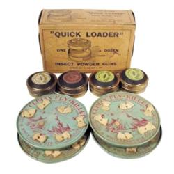NOS fly destroyers: 4 Climax Fly-Killers, lithographed tin & partial box "Quick Loader" insect powder guns, pat. 1893, Am. Can Co.