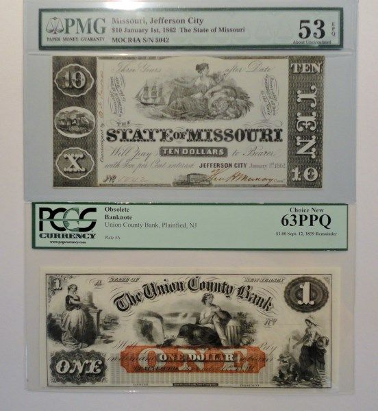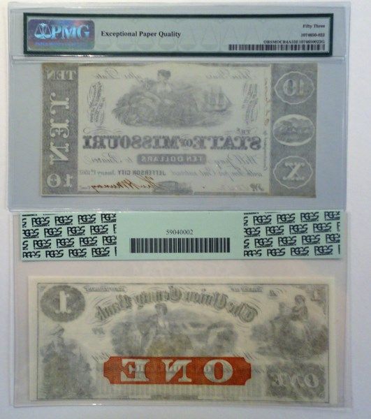 NOTES: 1862 $10.00 MISSOURI PMG 53; PLAINFIELD, NEW JERSEY 63 PPQ