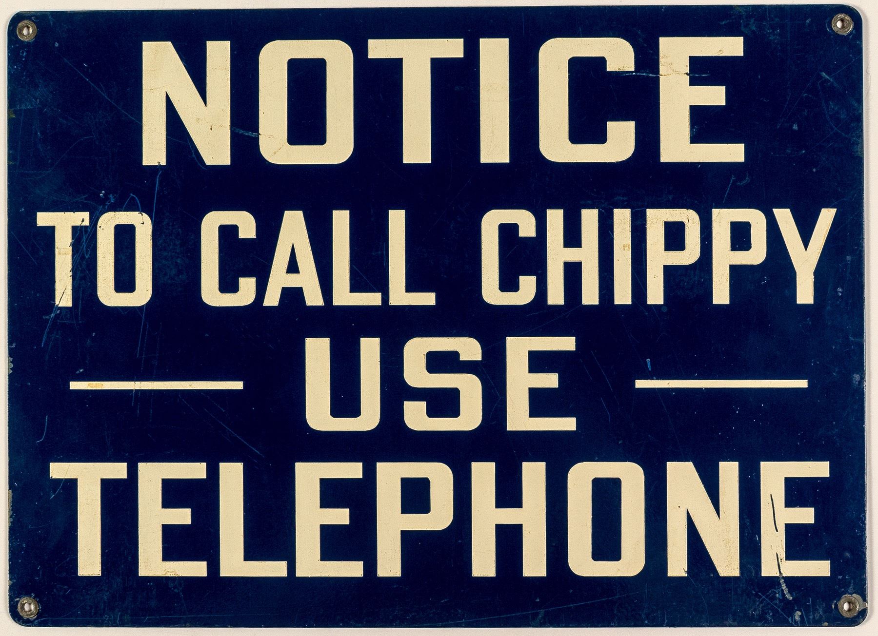 White lettering on blue enamel, 14 x 10 inches. "NOTICE / to call chippy / use / telephone." The "chippy" hoist was an auxiliary hoist, one that carried men and materials not ore or muck. State: City: HWAC#: 47416 Date: