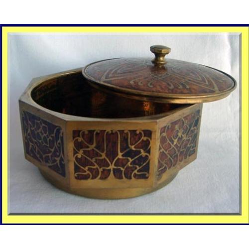 Antique octogonal lidded bowl / box, humidor. Made of brass, gilt lined and inlaid precious woods. European origin. Style dates it to Art Nouveau / Arts Crafts era circa 1880- 1910. <P><P>