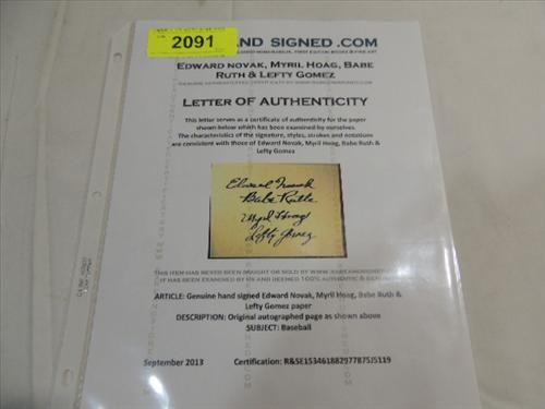 EDWARD NOVAK, MYRIL HOAG, BABE RUTH & LEFTY GOMEZ CUT SIGNATURE AUTOGRAPH. NO COA. AS SHOWN. VIEW PICTURE FOR DETAIL.