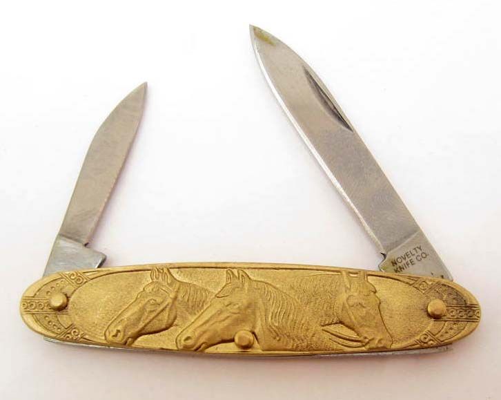 NOVELTY KNIFE CO. HORSE BRASS POCKET KNIFE APPROX. 3"