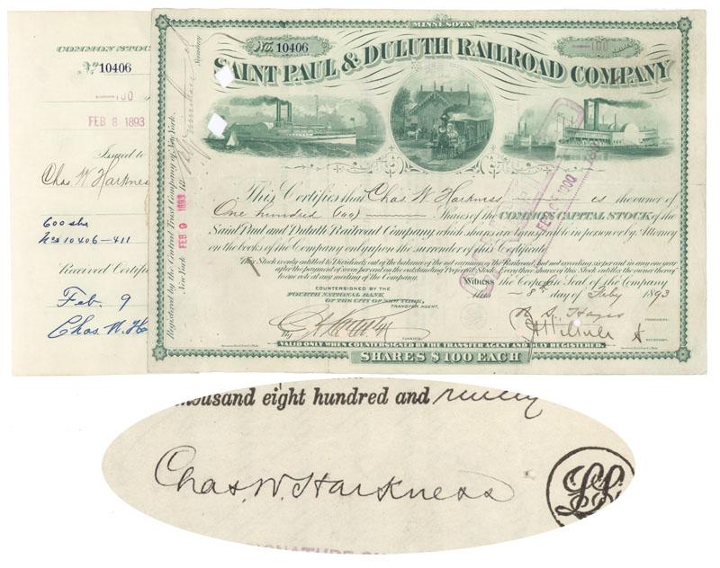 1893, Minnesota. Stock certificate for 100 shares. Green Lovely triple-vignette certificate depicting a steam locomotive at center flanked by steamboats at both sides. Engraved by American Bank Note Company. Issued to and signed by CHARLES WILLIAM HARKNESS (1860-1916). Cleveland, Ohio. Lawyer and industrialist in New York and generous benefactor of Yale.