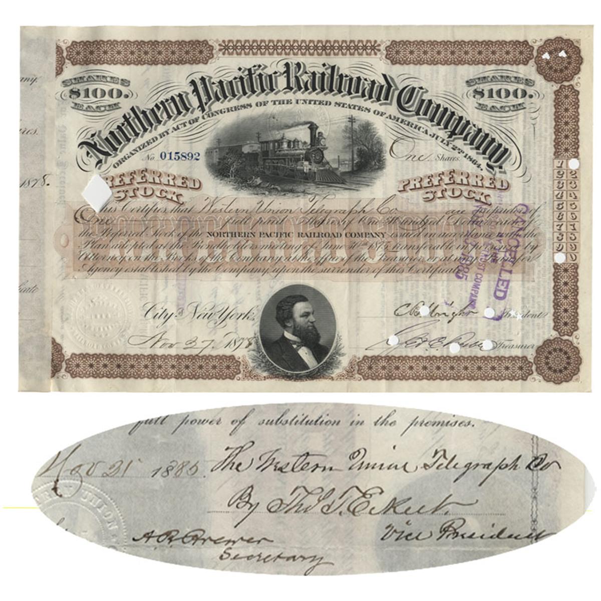 THOMAS THOMPSON ECKERT. [(1825-1910). General manager, vice president and president of Western Union and a Union Army Officer. In 1862, Edwin M. Stanton, the new Secretary of War, appointed Thomas Eckert as chief of the War Department telegraph office. An aggressive and able leader with a great deal of pre-war telegraph experience, Eckhart was largely credited with ensuring that the telegraph was successfully utilized by Union forces in the field. Throughout the war years, President Lincoln was a regular visitor to Eckert’s office, and the two men quickly became close friends and confidants. The bond between the two was so great that Eckert was to attend Our American Cousin as Lincoln's bodyguard, but was not allowed to do so by Stanton. Instead, he found himself among the grieving few that stood by the dying president at the Peterson House later that tragic evening. 1878, New York Stock certificate for 1 share of $100. Brown\Black. Engraved vignette of a steam locomotive at top center, portrait vignette of Frederick Billings at bottom. Issued to Western Union Telegraph Company. Endorsed on verso by Thomas T. Eckert as Vice president of the company. Folds. Fine.