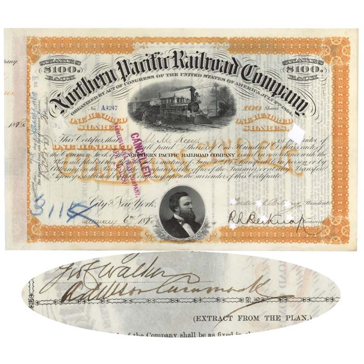 1880, New York. Stock certificate for 100 shares. Orange. Engraved vignette of a steam locomotive at top center, nice portrait vignette of Frederick Billings at bottom. Signed as president by Frederick Billings and also signed on verso by Addison Cammack [one of the shrewdest traders in the stock market, Cammack was involved with Jay Gould and James Keene in numerous ventures, including Gould's attempt to "break" Western Union stock. Stamp and punch cancelled. Fine.