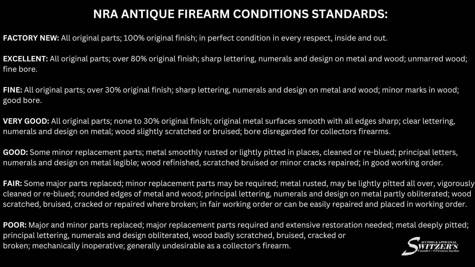 As of October 2023, Switzer's Auction is now using the NRA Antique standards for grading antique firearms.
