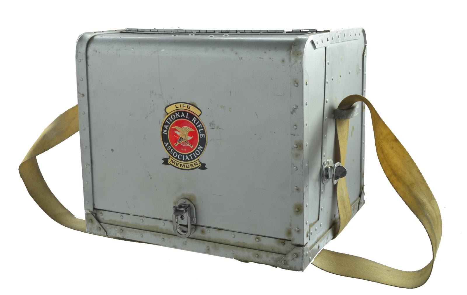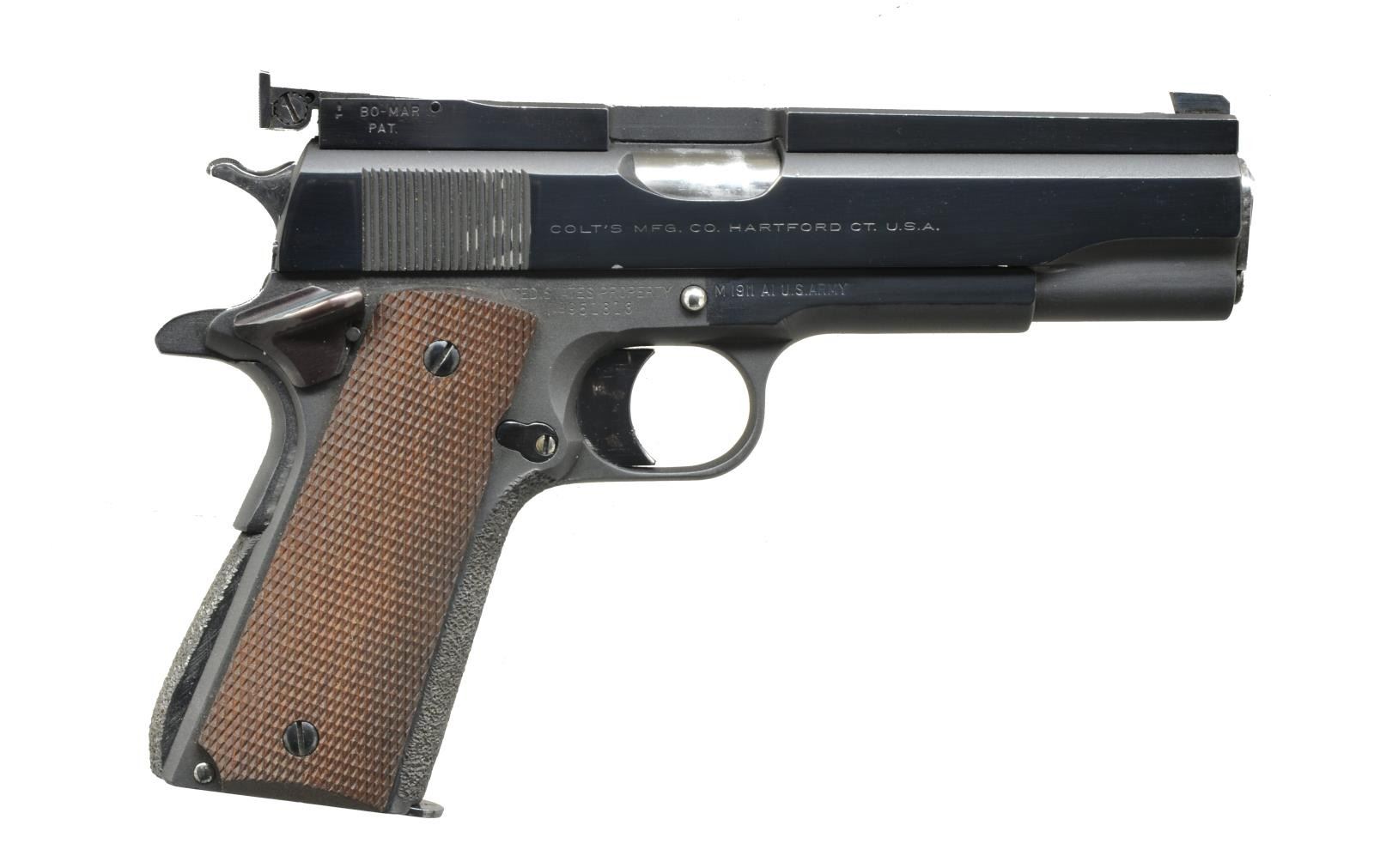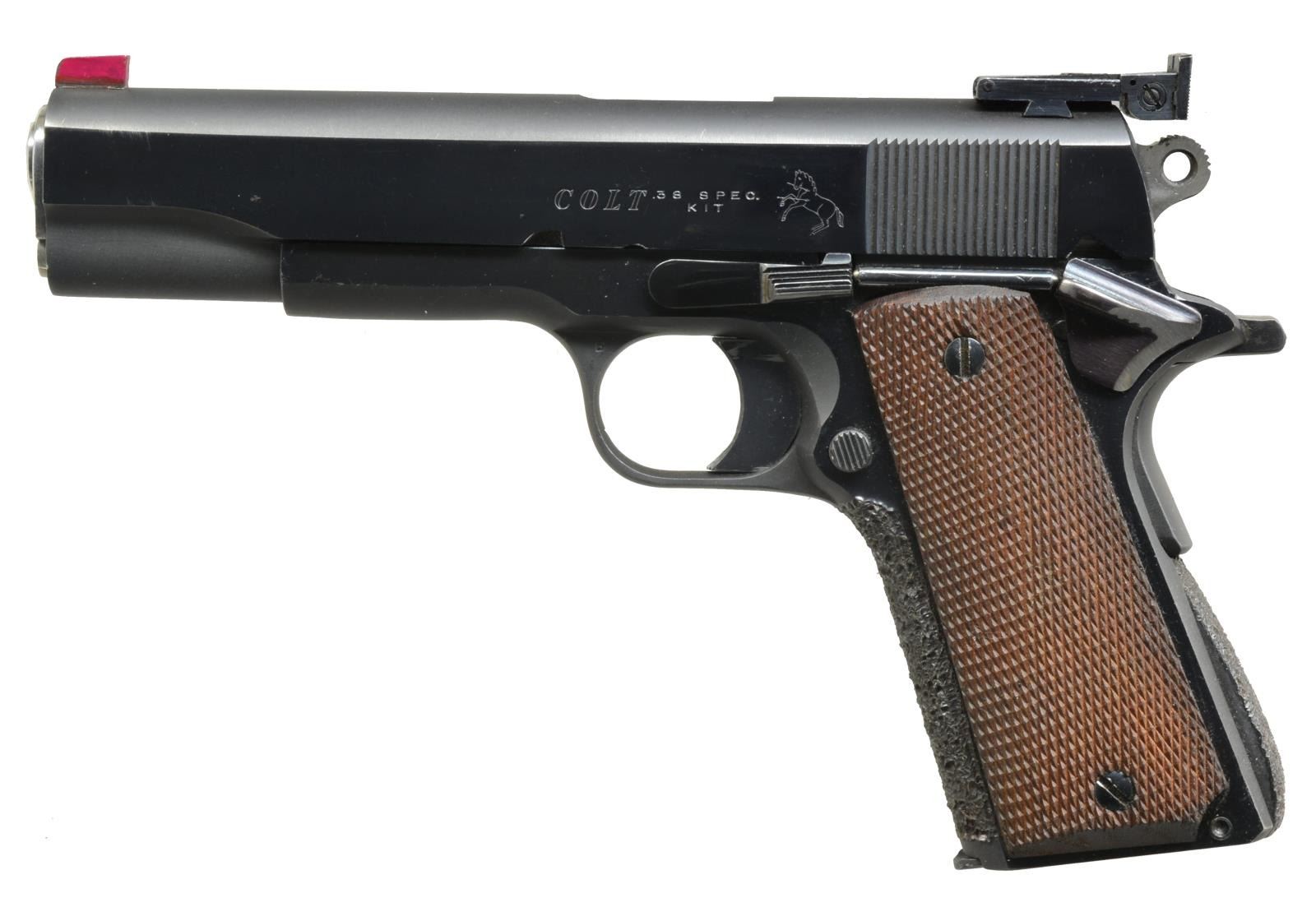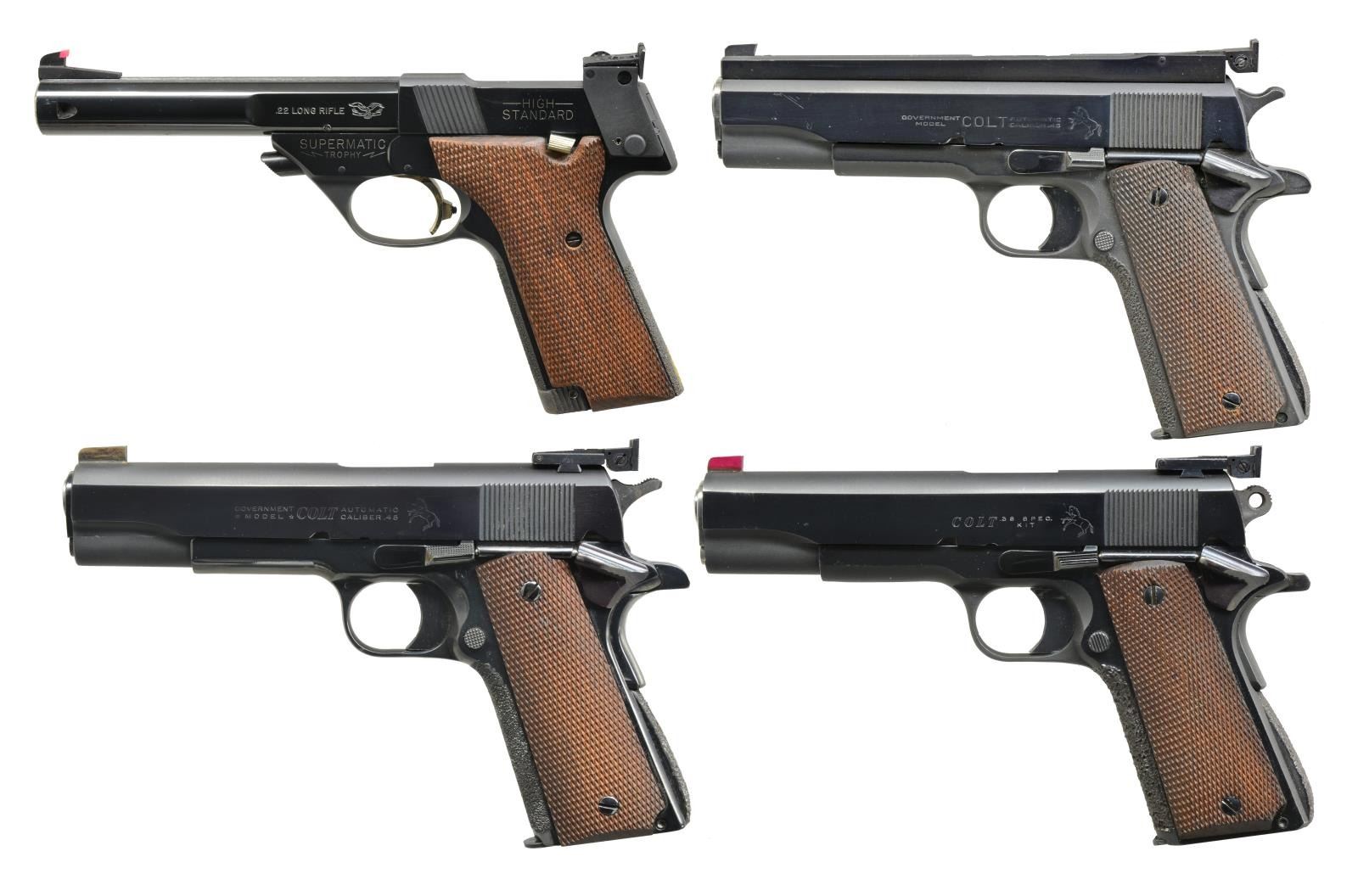ACCESSORIES. Pistol case custom made of aluminum w/ military like riveted construction, piano hinge, locks, & removable pistol tray for up to 4 handguns. Interior has 3 compartments for ammo, mags., etc. Top lid w/ olive drab colored military style spotting scope having triangular name plate marked "Telescope / Observation / J-M48 / No. J-279" plus near excellent optics. Case has nylon aircraft like seatbelt style carry strap & is in good condition having signs of many years of use, yet ready for more. Consignor states that 1911 style pistols were built by Louis Willing who was Chief Armourer of USAF Advanced Marksmanship Training Unit at Lackland in Texas. Willing was Distinguished Marksman & member of President's Hundred. Pistols approximate those built & used by AMU. Consignor further states Jack Maple, one of the first members of Eisenhower's 1956 AMU as well as 1994 inductee into US Army Marksmanship Hall of Fame, checked over the handguns to certify they are fit for many more years of competitive shooting. Maple was Chief Armourer at Ft. Benning, Georgia. This is a great & complete Bullseye pistol shooter's package that would be difficult to improve upon. Get you favorite ammo & compete! 1) REMINGTON RAND MODEL 1911-A1. Cal. 45 ACP. S# 951813. Bbl. 5" US match w/ drawing numbers & matching bushing; polished & throated. Lightly polished feed ramp. Flared ejection port. Mfg. 1943 w/ FJA & P proof. Designed for wadcutter target loads. Bo-Mar rib w/out Accuracy Tuner having undercut match front sight & adjustable target rear. Colt Government Model commercial slide fitted to frame. Frontstrap & arched mainspring housing heavily stippled for secure gripping; military housing w/out lanyard loop (cut flush to bottom). Fully checkered walnut grips. 1911-1924 Style slide stop; checkered w/ undercut. Modern ambidextrous safety. Long steel trigger w/ serrated face & over travel adjustment. Sandblast blued finish on frame except for high polish forward of slide stop pivot. Sides of slide & rib are high polished as are: trigger, mag. latch, slide stop, top of grip safety, bottom of mainspring housing & grip screws. High polish in the white for bbl. busing, sides of hammer, mag. latch screw & top of slide stop pivot. MAGS: 2 very good 7 rd. w/ polished followers (in the white) & blued bases electro engraved w/ pistol S#. Mags. by MS Little & Scovill (marked "C-S"). CONDITION: overall very good plus condition w/ great trigger pull. Sides of slide have faint, over polished markings along w/ frame markings on right, forward of slide stop pin. Very faint function wear along w/ occasional light marks. Slide functions on frame w/ slight "hitch" when removed. (20-2389/NW). MODERN. 2) REMINGTON RAND MODEL 1911-A1. Cal. 45 ACP. S# 2202665. Bbl. 5" US match w/ drawing numbers & matching blued bushing; polished & throated. Polished feed ramp. Mfg. 1945 w/ FJA & P proof. Designed for military ball ammo. Patridge blade match front sight & adjustable Bo-Mar target rear. Colt Government Model commercial slide fitted to frame. Frontstrap & arched mainspring housing heavily stippled for secure gripping; military housing w/out lanyard loop. Fully checkered walnut grips. 1924-1945 Style slide stop; checkered w/out undercut. Modern ambidextrous safety. Long steel trigger w/ serrated face & over travel adjustment w/ lock screw. Polished blued finish throughout. Bbl., sides of hammer & mag. latch screw are in the white. MAGS: 2 very good 7 rd. electro engraved w/ pistol S# plus "#1" & "#2". Mags. unmarked & Scovill (marked "C-S"). CONDITION: overall very good to excellent condition w/ great trigger pull. Sides of slide have faint, over polished markings along w/ frame markings. Very faint function wear. Slide functions smoothly. (20-2390/NW). MODERN. 3) COLT MATCH 38 SPECIAL KIT. Cal. 38 Spl. Wadcutter. S# 00643-H. Bbl. 5" "KIT" marked. Mfg. just after 1970 by Colt for custom building match pistols like those of AMU in 38 AMU cal. Originally conceived by famed pistol expert & dealer Gil Hebard (H in S#?) as means to have Colt wadcutter pistol to compete w/ famous S&W Model 52 match pistol. Slide kits were also available from Colt to match other frames. Kit slide w/ red painted Patridge front blade & Bo-Mar adjustable rear sight. Frontstrap & arched mainspring housing heavily stippled for secure gripping; military housing w/out lanyard loop (cut flush to bottom). Fully checkered walnut grips. Serrated slide stop. Modern ambidextrous safety. Long steel trigger w/ serrated face & over travel adjustment w/ lock screw. Polished blued finish throughout w/ matte edges. Bbl., sides of Commander hammer & mag. latch screw, bbl. bushing & full length guide rod (rod not present; has standard match spring guide w/ rounded front) style spring plug are in the white. MAGS: 2 very good Colt 5 rd. w/ removable bases. CONDITION: an occasional faint mark & very light function wear; all other aspects near excellent including bore & grips. (20-2391/NW). MODERN. 4) HIGH STANDARD SUPERMATIC TROPHY. Cal. 22 LR. S# 1607405. Bbl. 5 1/2" bull w/ Hamden address plus bottom drilled & tapped for bbl. weights. Undercut target front sight w/ addition of pink square bead plus milled for muzzle brake; recessed crown. Frame mounted adjustable rear target sight. Mfg. 1967-1968 w/ catalog #9247 (#9248 w/ 7.25" fluted bbl.). Checkered walnut grips w/out thumbrest. Gold plated safety & trigger w/ over travel adjustment. Case colored bottom mag. release. Stippled grip straps having HS signature gold bullet at base of rear. Optional HS high polish finish. Rt. side of frame marked "MODLEL 106 / MILITARY". MAGS: 2 factory 10 rd. w/ factory marked skeletonized red bases & green followers. UNATTACHED ACCESSORIES: matching 7.25" fluted Hamden bbl. w/ gold lettering, recessed crown & Patridge sight. Sm. spots of light oxidation plus light marks from frame & bbl. weight attachment; all other aspects including bore are near excellent. UNATTACHED ACCESSORIES: printed 