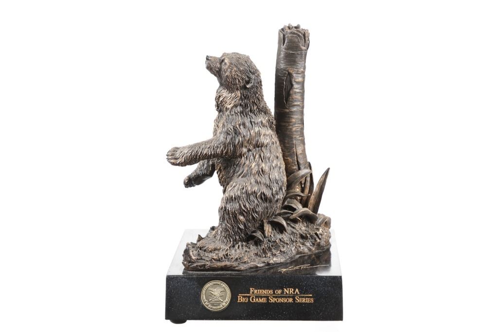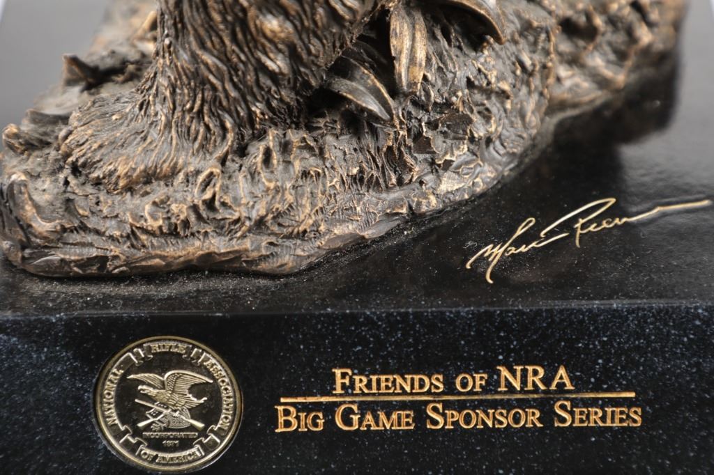 Featured in this lot is this Friends of the NRA, Big Game Sponsor Series bear sculpture titled, "Unbearable Itch" done by Big Sky Carvers circa 2011. The piece was presented to supporters and sponsors of the NRA in the year of 2011. The sculpture depicts a bear trying to scratch an itch on his back against a large tree. The inspiration comes from Dan Smith's 2011 Friends of the NRA Print of the Year. "Dan has observed these magnificent bears in the wild beneath the big sky of Montana and shouldered slopes of Mt. McKinley in Alaska... Taking a break, our Grizzly finds the perfect scratching tree, a simple pleasure in the long summer days of foraging for food in preparation for a long and sometimes harsh winter." Each of these sculptures is cast in fine resin and has a bronze patina applied after the process. The sculpture sits on a gold engraved, faux black marble base and includes a National Rifle Association medallion set in the face of the base. The base reads, "Friends of the NRA / Big Game Sponsor Series" in gold lettering. The piece shows good condition overall with no wear present. The base is missing two pads, making the base uneven. No other signs of damage are noted. The piece measures 6 7/8" L x 6 7/8" W x 11 1/8" H and weighs 6 pounds and 10 ounces.