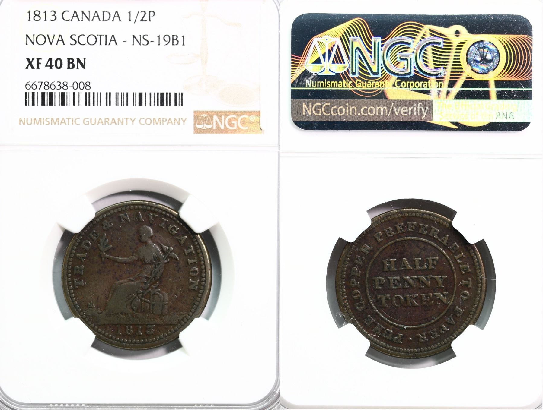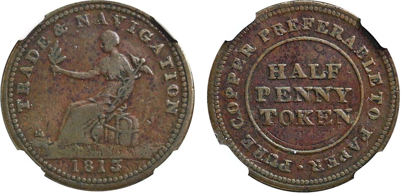 NS-19B1, Breton 963 - 1813 Trade & Navigation 1/2P Token, Plain NGC Extra Fine-40. Extremely Rare and not priced in Charlton. Exessively scarce. A similar example in Choice About Uncirculated-55 brought in $10,217 at our 2023 New Year's Sale.