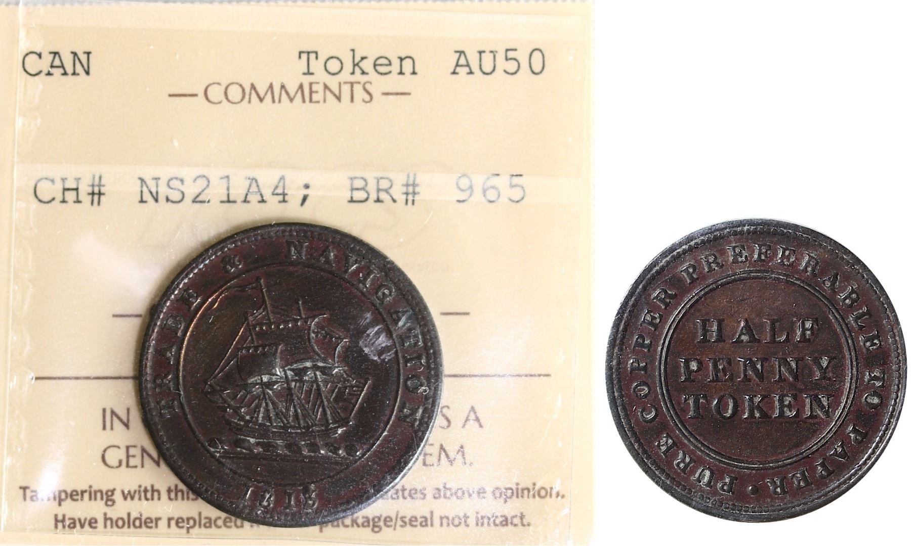 NS-21A4, Br:# 965 ICCS AU50. Halfpenny token 1813 depicting a ship, Flaw at "3" of date