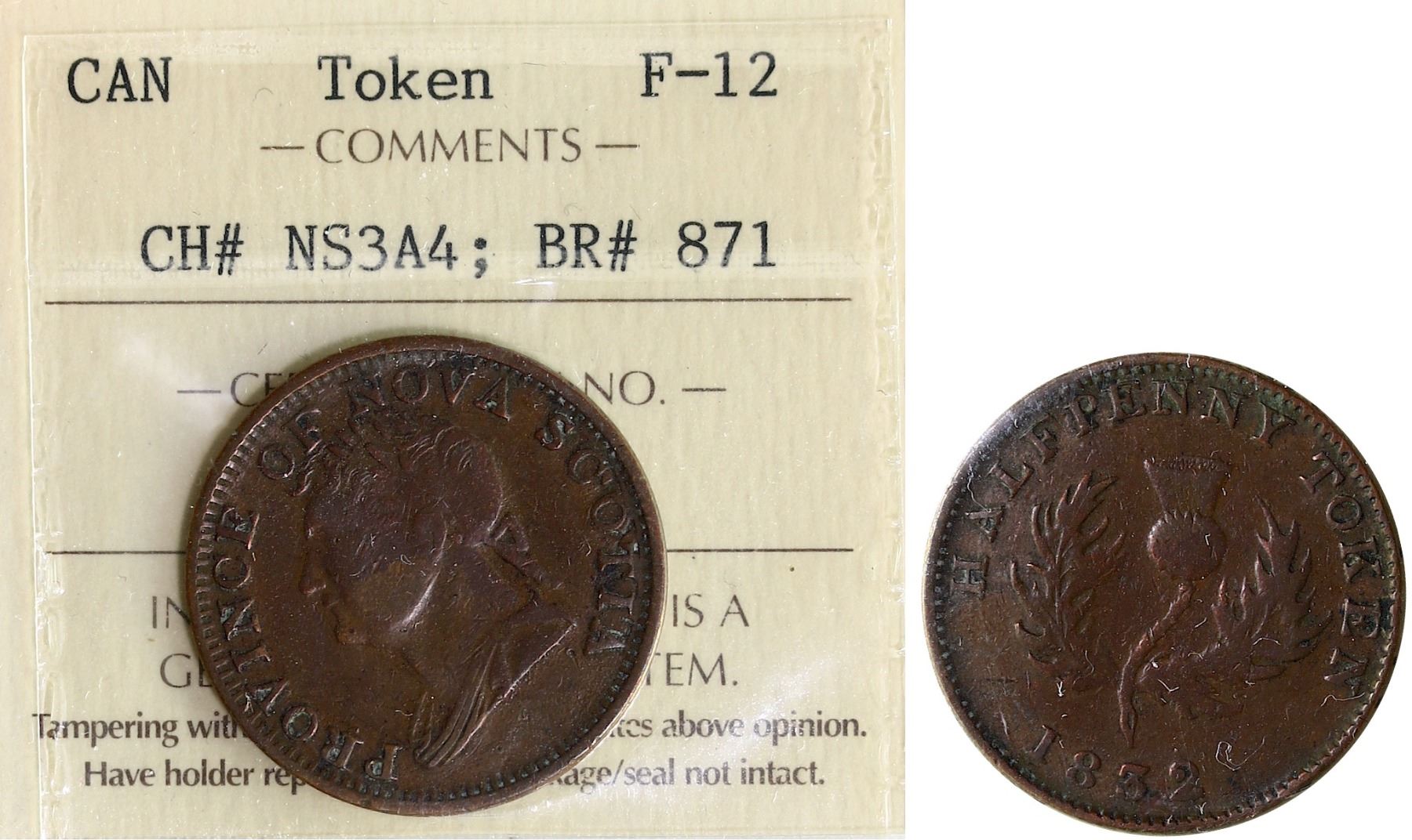 NS-3A4, Br:# 871, Clash variety of the countemporary counterfeit of 1832 Nova Scotia token, ICCS F12.