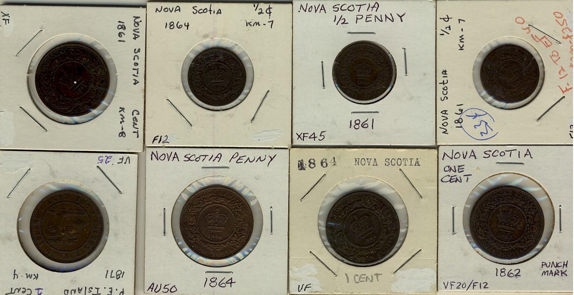 NS and PEI Lot of 8 pieces, includes 1/2¢ 1861 (2), 1864. 1¢ 1861, 1862, 1864 (2), PEI 1871 1¢. Grades vary from F12 to EF40.