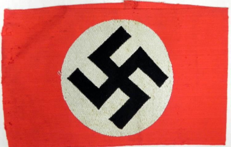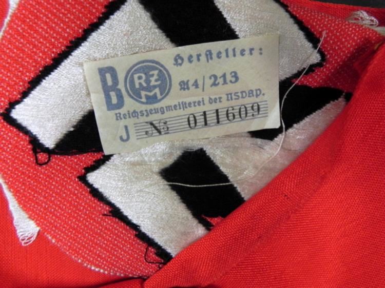 OFFERED HERE IS A NSDAP-NAZI PARTY ARMBAND-ORIGINAL W/RZM TAG. IT IS 4 1/4" WIDE--WELL MADE WITH SWASTIKA CENTER-COUPLE OF MOTH NIPS ON SIDE.