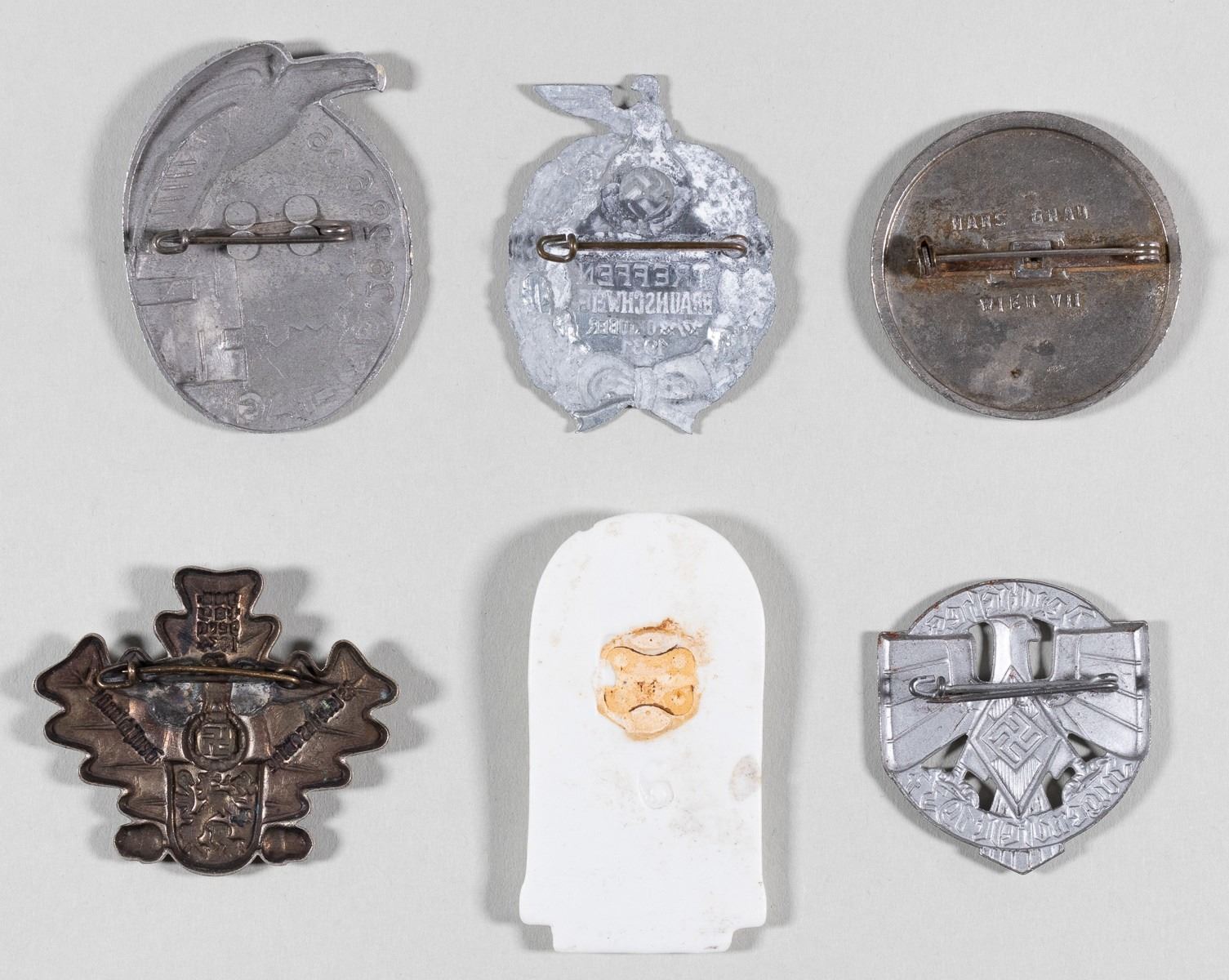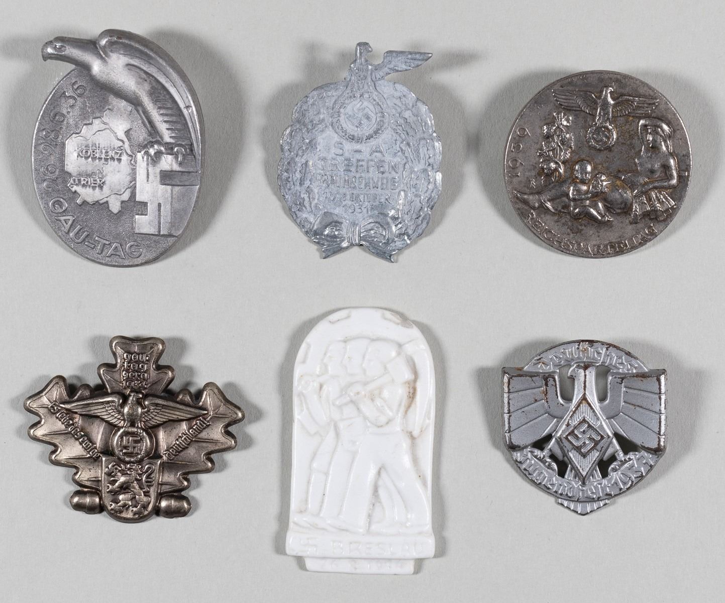 Lot of six tinnies of Reichs Party Rally, Youth meeting, Gau meetings, and Breslau. One is partially broken. Dating from 1931 to 1939. Sold as-is.
