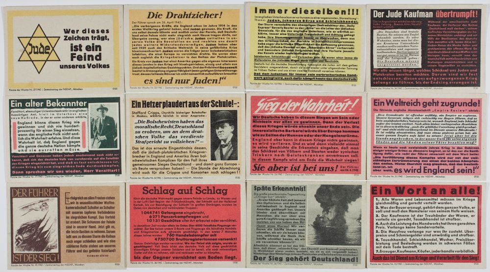 Group of 12 propaganda cards published by the NSDAP, each 4" x 3" and concerning anti-Allies and anti-Semitic topics. Examples include a card bearing a Star of David and warning: "Whoever wears this symbol is an enemy of our people!", another also bearing a Star of David claiming that Jews are rewarded only through crime, claims against Jewish retailers, a quote by Goring praising Hitler, etc. Fine.