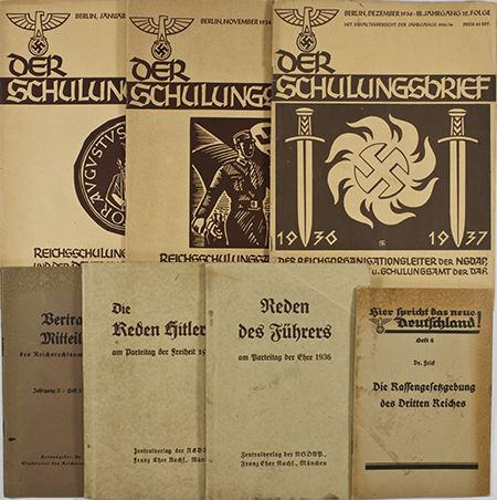 Lot of seven publications issued by the NSADP, includes: "Race Laws of the Third Reich" by Wilhelm Frick, 1934, 16pp. 8vo., an explanation to the press corps of Germany's race laws as given by Frick at a reception; two volumes of Hitler's speeches given on Reichs Party Day, 1935 and 1936, 80pp. and 86pp.; three copies of "Der Schulungsbrief", a primer on German history, race, the Nazi movement, politics, etc., published by Dr. Robert Ley, 1934 and 1936, each about 46pp., and "Confidential Information of the Reichs Justice Office", procedures, changes in laws, etc., 1936, 32pp. 8vo. Overall very good.