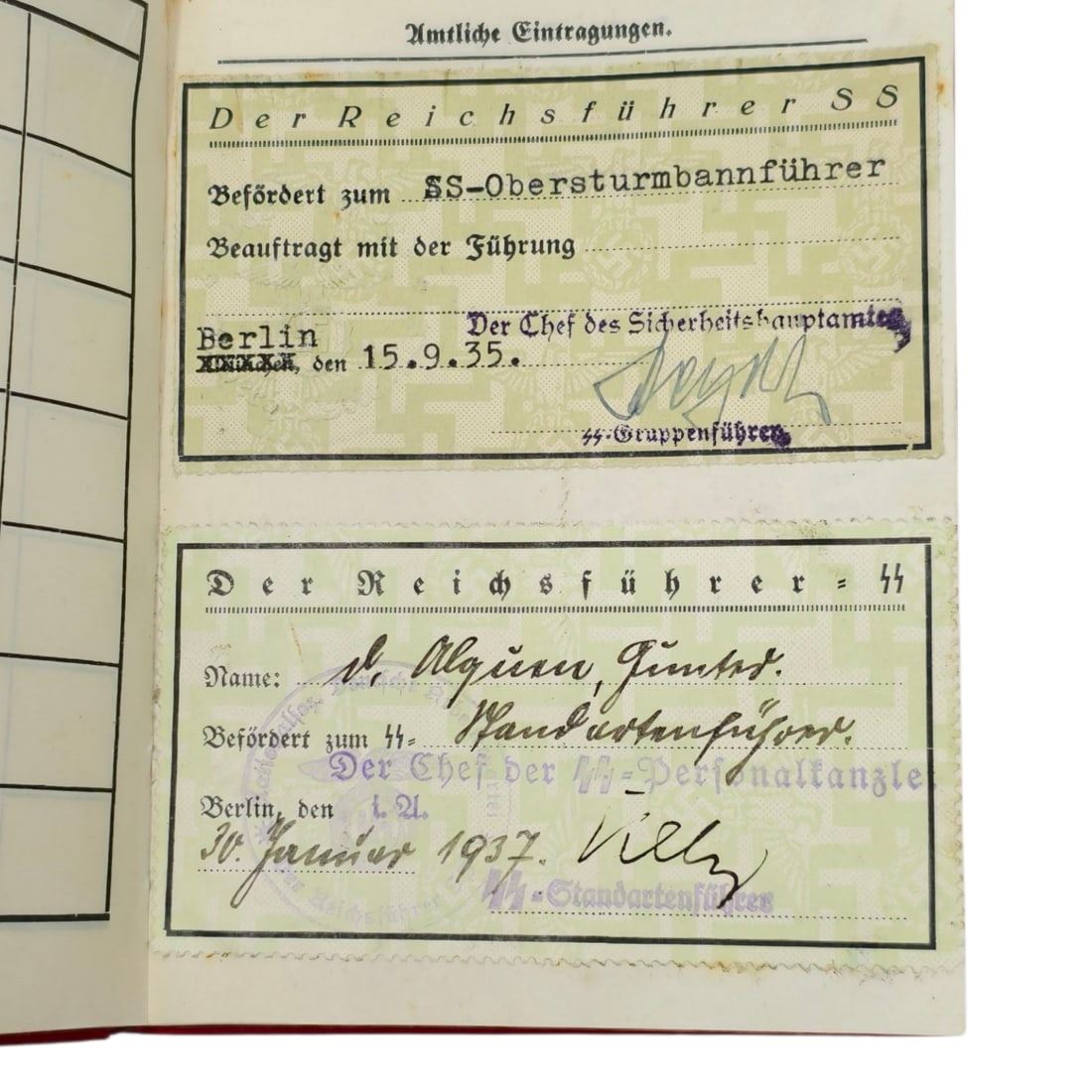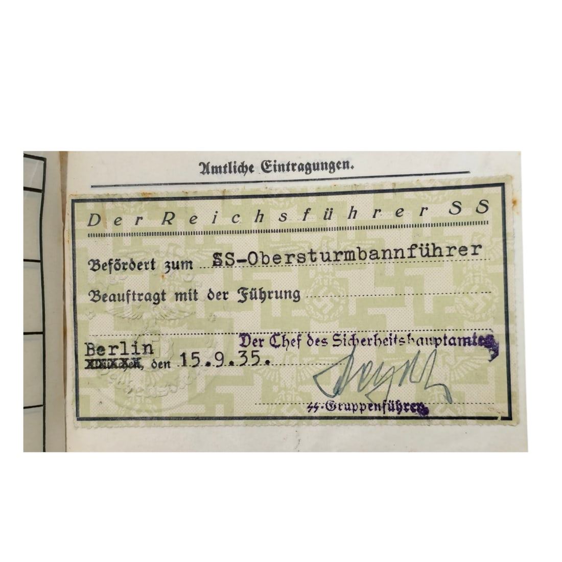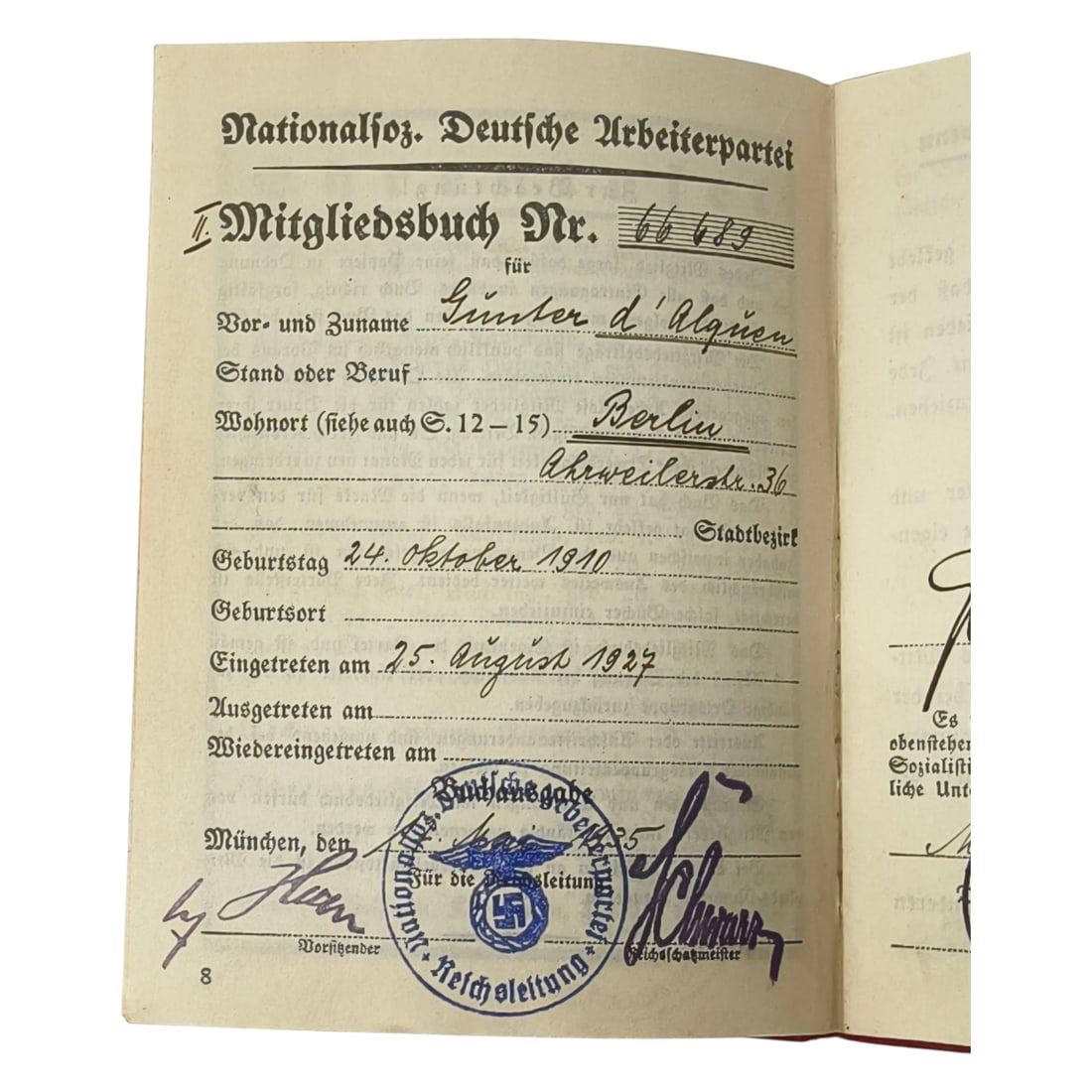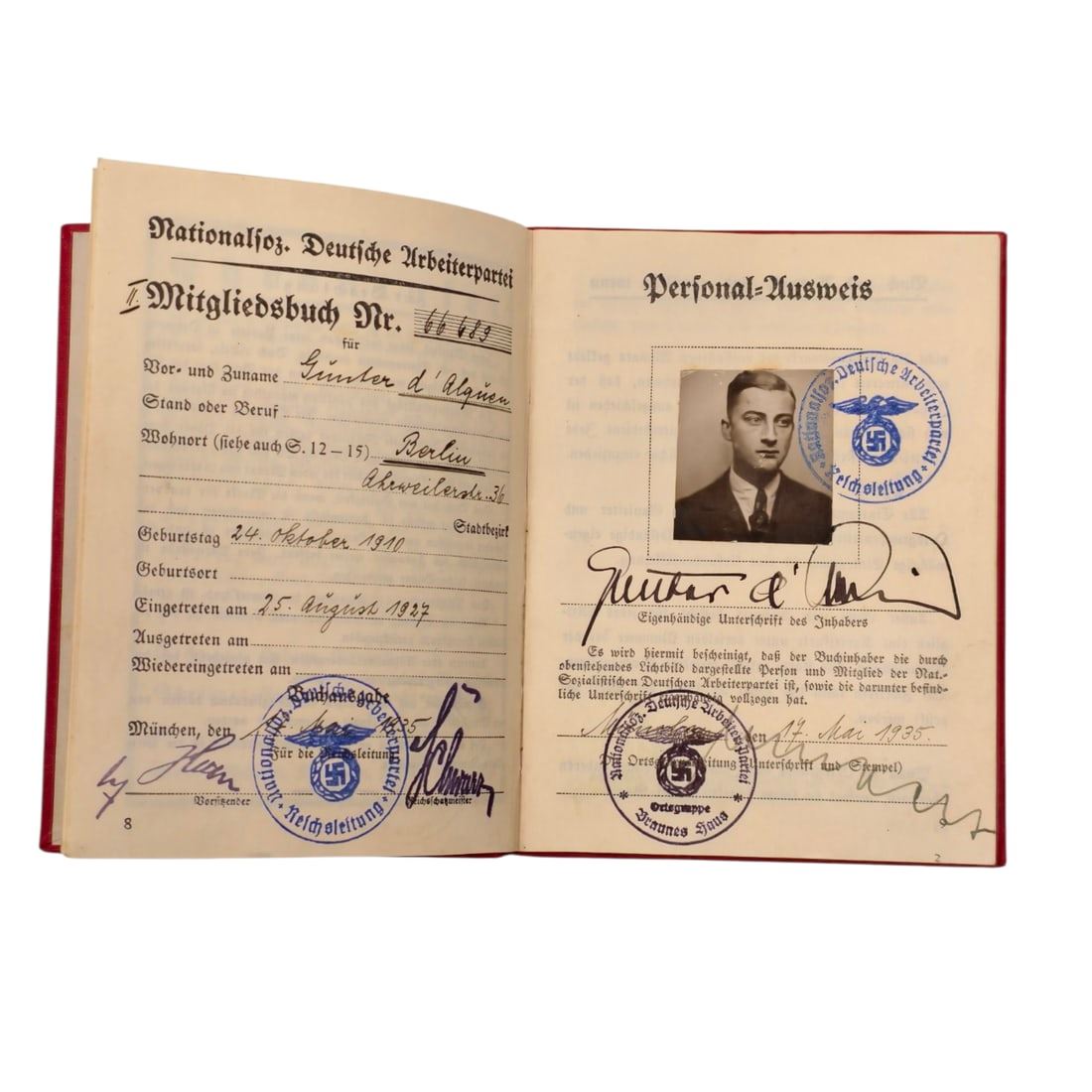 NSDAP Party Membership Book for Gunter d'Alquen with Heydrich Signed Promotion Page. Incredible piece belonging to a well known SS officer who was close to Heinrich Himmler. One of the promotion slips inside the party book is signed by Reinhard Heydrich. Gunter d'Alquen (24 October 1910 – 15 May 1998) was chief editor of the weekly Das Schwarze Korps ("The Black Corps"), the official newspaper of the Schutzstaffel (SS), and commander of the SS-Standarte Kurt Eggers. Gunter d'Alquen was born to a Catholic-Freemason wool merchant and reserve officer named Carl d'Alquen, in Essen on 24 October 1910.[1][2] He attended grammar school in Essen and joined the Hitler Youth in 1925[dubious – discuss]. In 1927, d'Alquen became a member of the SA and as a 16-year-old joined the NSDAP.D'Alquen was active in the National Socialist German Student Union. He became a member of the SS on 10 April 1931. He did not complete his studies in history and philology and instead turned to a journalistic career. From 1932, he was a political correspondent to the editorial board of the Völkischer Beobachter ("Völkisch Observer"). It was here he aroused the attention of Heinrich Himmler, who appointed him chief editor of Das Schwarze Korps in March 1935. D'Alquen's newspaper often attacked intellectuals, students, Freemasons, certain scientists, rebellious businessmen, traffickers, clerics and other representatives of German society that had aroused Himmler's anger. With its notorious anti-Semitism, Das Schwarze Korps established itself as a moral spokesperson of Nazi beliefs.From September 1939, d'Alquen became a prominent SS war correspondent. He was appointed head of the propaganda formation SS-Standarte Kurt Eggers named after Kurt Eggers, a friend of d'Alquen, an SS war correspondent and editor of Das Schwarze Korps who was killed in action in 1943.[3]