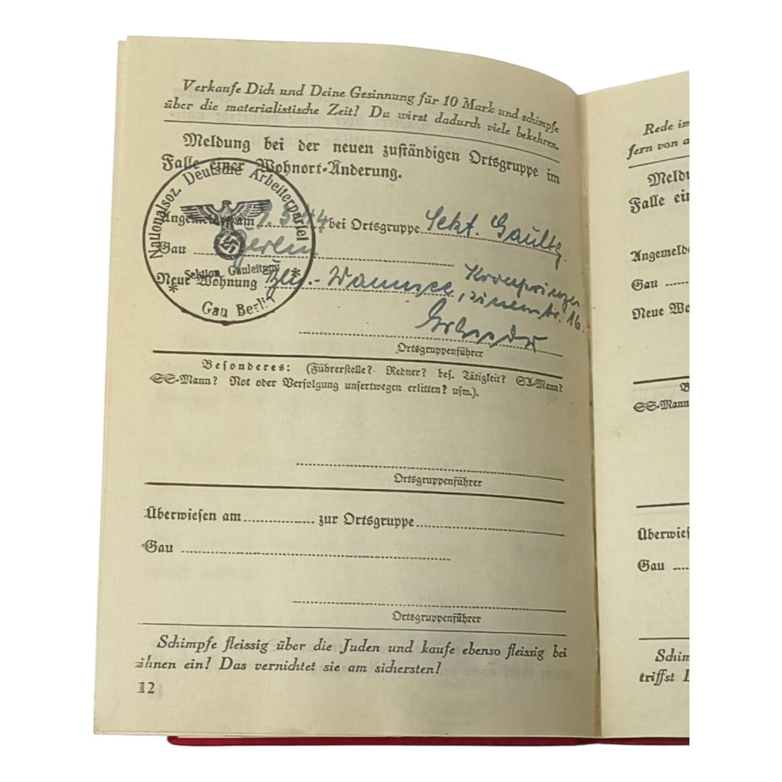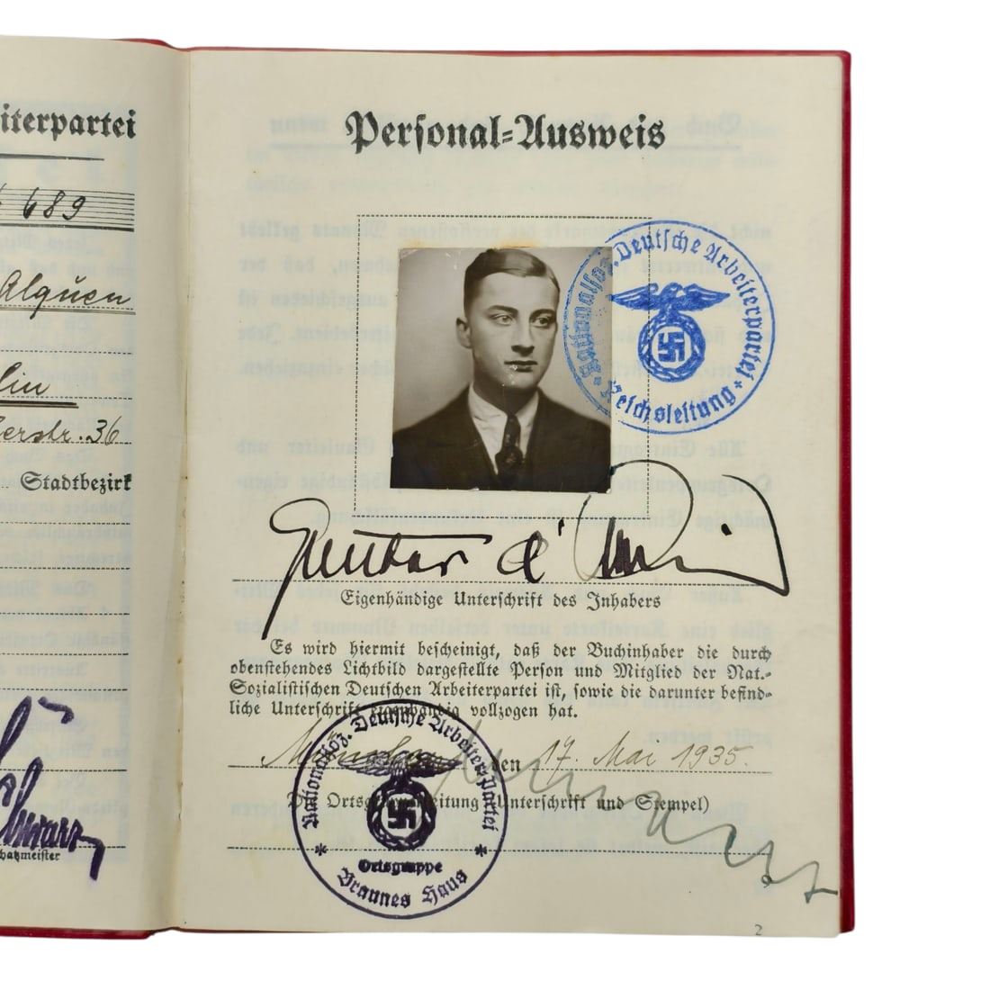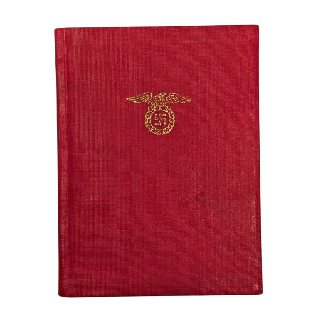 NSDAP Party Membership Book for Gunter d'Alquen with Heydrich Signed Promotion Page. Incredible piece belonging to a well known SS officer who was close to Heinrich Himmler. One of the promotion slips inside the party book is signed by Reinhard Heydrich. Gunter d'Alquen (24 October 1910 – 15 May 1998) was chief editor of the weekly Das Schwarze Korps ("The Black Corps"), the official newspaper of the Schutzstaffel (SS), and commander of the SS-Standarte Kurt Eggers. Gunter d'Alquen was born to a Catholic-Freemason wool merchant and reserve officer named Carl d'Alquen, in Essen on 24 October 1910.[1][2] He attended grammar school in Essen and joined the Hitler Youth in 1925[dubious – discuss]. In 1927, d'Alquen became a member of the SA and as a 16-year-old joined the NSDAP.D'Alquen was active in the National Socialist German Student Union. He became a member of the SS on 10 April 1931. He did not complete his studies in history and philology and instead turned to a journalistic career. From 1932, he was a political correspondent to the editorial board of the Völkischer Beobachter ("Völkisch Observer"). It was here he aroused the attention of Heinrich Himmler, who appointed him chief editor of Das Schwarze Korps in March 1935. D'Alquen's newspaper often attacked intellectuals, students, Freemasons, certain scientists, rebellious businessmen, traffickers, clerics and other representatives of German society that had aroused Himmler's anger. With its notorious anti-Semitism, Das Schwarze Korps established itself as a moral spokesperson of Nazi beliefs.From September 1939, d'Alquen became a prominent SS war correspondent. He was appointed head of the propaganda formation SS-Standarte Kurt Eggers named after Kurt Eggers, a friend of d'Alquen, an SS war correspondent and editor of Das Schwarze Korps who was killed in action in 1943.[3]