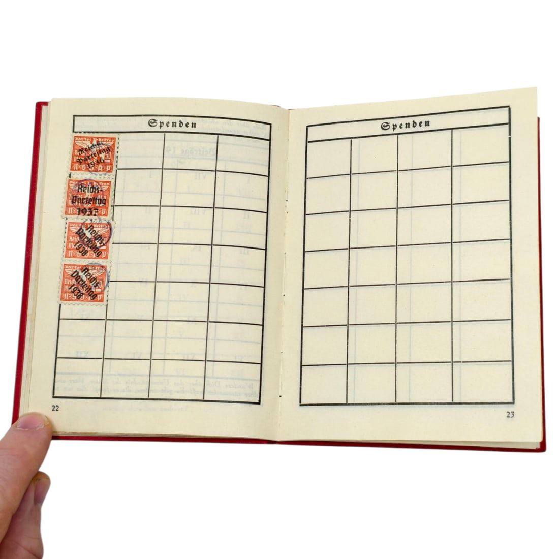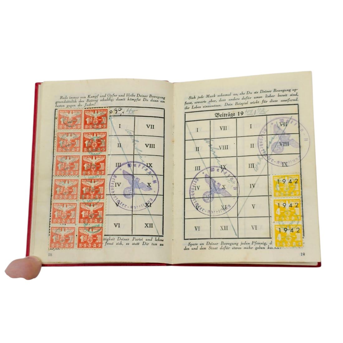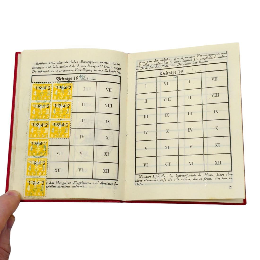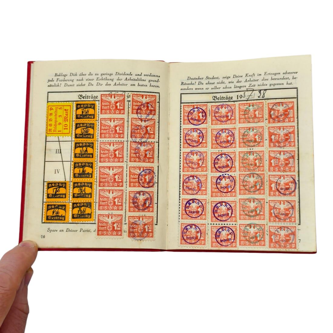 NSDAP Party Membership Book for Gunter d'Alquen with Heydrich Signed Promotion Page. Incredible piece belonging to a well known SS officer who was close to Heinrich Himmler. One of the promotion slips inside the party book is signed by Reinhard Heydrich. Gunter d'Alquen (24 October 1910 – 15 May 1998) was chief editor of the weekly Das Schwarze Korps ("The Black Corps"), the official newspaper of the Schutzstaffel (SS), and commander of the SS-Standarte Kurt Eggers. Gunter d'Alquen was born to a Catholic-Freemason wool merchant and reserve officer named Carl d'Alquen, in Essen on 24 October 1910.[1][2] He attended grammar school in Essen and joined the Hitler Youth in 1925[dubious – discuss]. In 1927, d'Alquen became a member of the SA and as a 16-year-old joined the NSDAP.D'Alquen was active in the National Socialist German Student Union. He became a member of the SS on 10 April 1931. He did not complete his studies in history and philology and instead turned to a journalistic career. From 1932, he was a political correspondent to the editorial board of the Völkischer Beobachter ("Völkisch Observer"). It was here he aroused the attention of Heinrich Himmler, who appointed him chief editor of Das Schwarze Korps in March 1935. D'Alquen's newspaper often attacked intellectuals, students, Freemasons, certain scientists, rebellious businessmen, traffickers, clerics and other representatives of German society that had aroused Himmler's anger. With its notorious anti-Semitism, Das Schwarze Korps established itself as a moral spokesperson of Nazi beliefs.From September 1939, d'Alquen became a prominent SS war correspondent. He was appointed head of the propaganda formation SS-Standarte Kurt Eggers named after Kurt Eggers, a friend of d'Alquen, an SS war correspondent and editor of Das Schwarze Korps who was killed in action in 1943.[3]