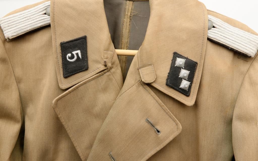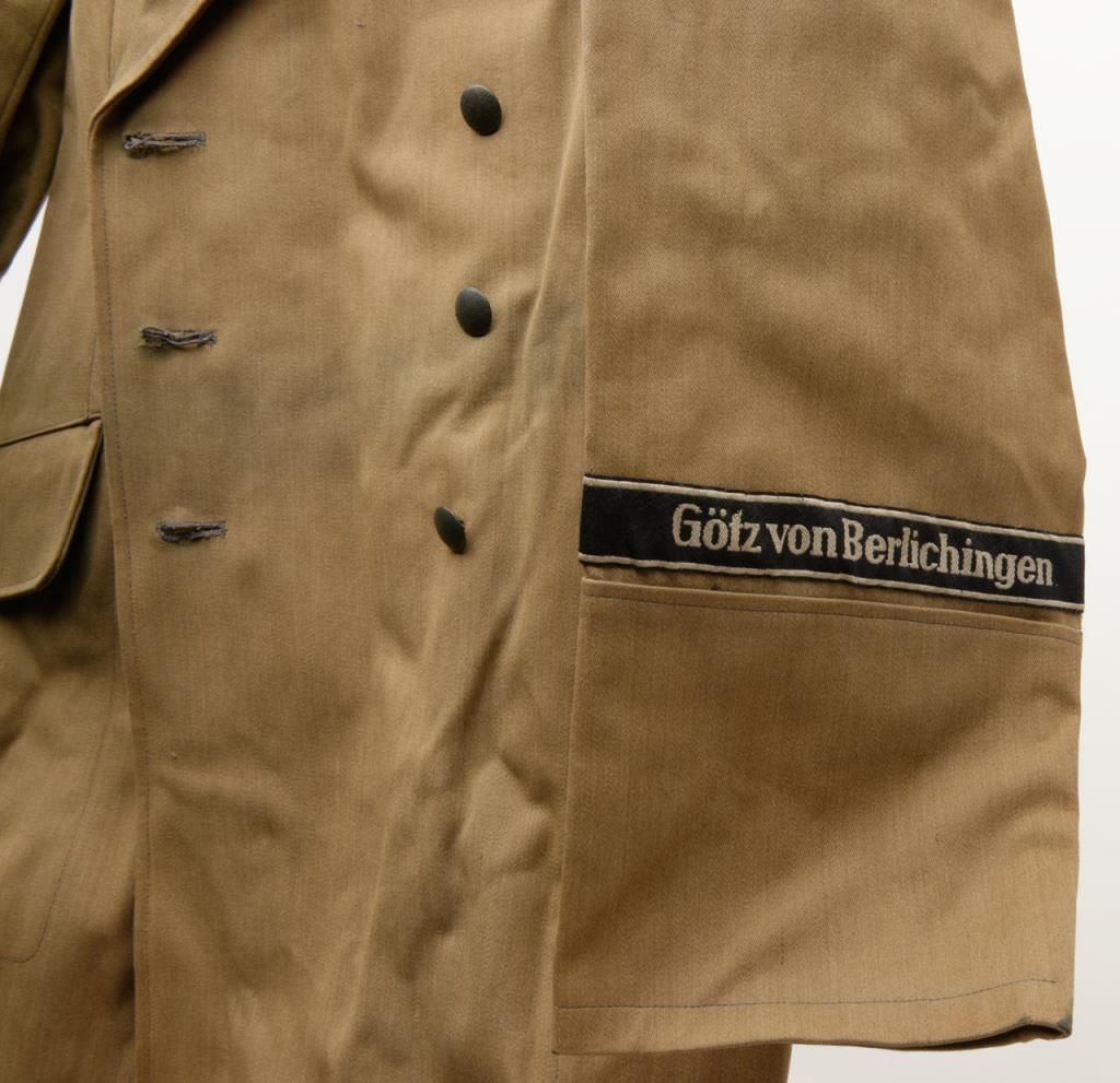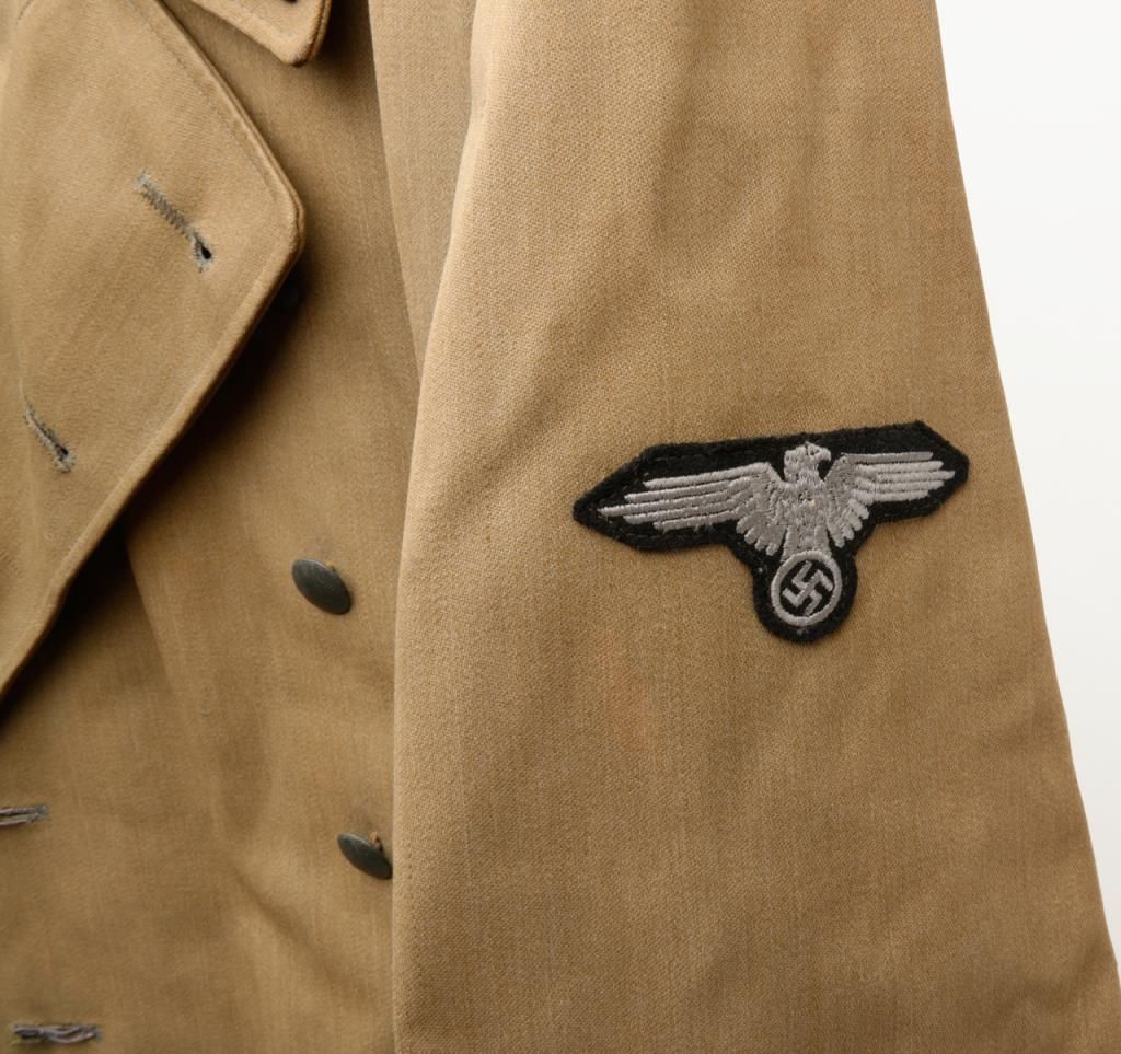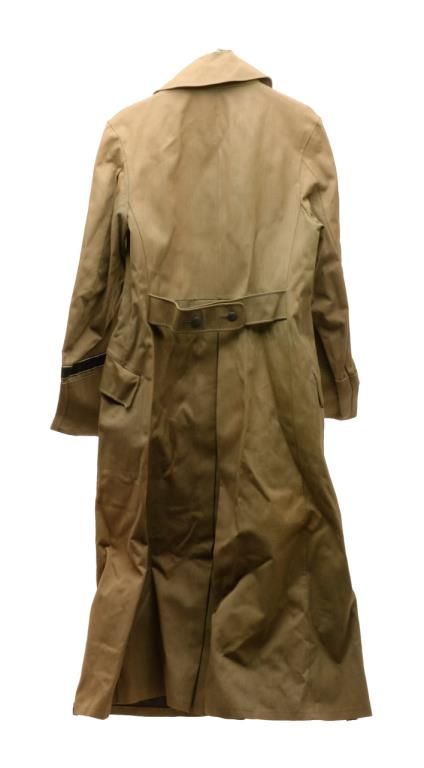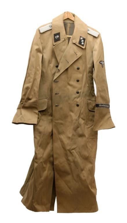 NSKK or Motorcorps style rubberized overcoat with upgraded insignia, other than sleeve title, which appears authentic. Est. $150-300.