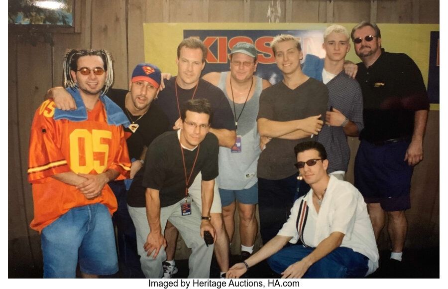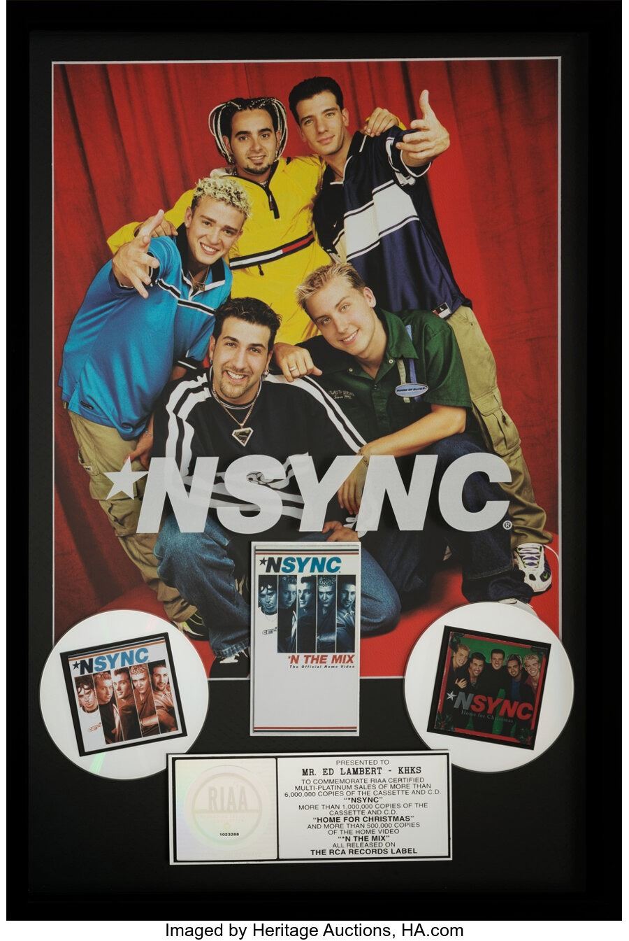 NSYNC Multi-Release RIAA Hologram Multi-Platinum Sales Award. A sales award for three NSYNC releases, presented to legendary radio programmer/DJ, "Mr. Ed" Lambert. According to the plaque in the bottom center portion, "Presented To / Mr. Ed Lambert – KHKS / To Commemorate RIAA Certified / Multi-Platinum Sales of More Than / 6,000,000 Copies of the Cassette and C.D. / ‘*NSYNC' / More Than 1,000,000 Copies of the / Cassette and C.D. / ‘Home for Christmas' / And More Than 500,000 Copies / Of the Home Video / ‘*N The Mix' / All Released On / The RCA Records Label." Measures 16 ¾" x 24 ¾". In Very Good Plus condition with wear in various spots on the frame. COA from Heritage Auctions.