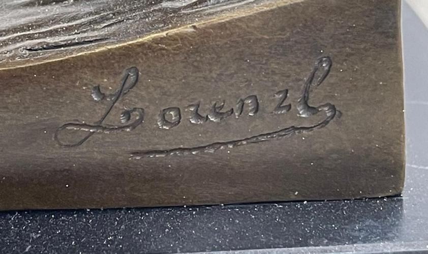 Standing tall and nude this bronze sculpture of “Diana the Hunter†was handmade and casted using the “Lost wax Methodâ€. She poses with her small breasts exposed as she releases her bow. You see the outline of her muscles and stomach as she leans back while unleashing her arrow. Standing on her toes she balances herself, bringing detail to her legs, as she looks straight ahead at her target. Her buttocks are tight and firm, her body is slender and natural. You see her muscles in her back and her arms as she shoots her bow. Her hair is wavy but and flows back in the wild winds of the forest. At her feet are two hunting dogs. This sculpture was cast using the “Lost Wax Method†and is mounted on a marble base.“Diana the Hunter†came from myths both from Italy and Greece. Most of the myths had started in Italy but were influenced quickly by Greece. It is hard to pinpoint information on Diana the Hunter as she was also known as “Diana Nemorensis†and “Artemisâ€. Below is a short myth about “Diana the Hunter†Diana was an ancient Italian goddess of woodland. In Capua and in Aricia, localities near Rome, there are still shrines dedicated to the Old Italian goddess. Her shrine in Aricia was on the shores of the lake Nemi. For that reason, she was named Diana Nemorensis, Diana of the Woods. The rites dedicated to her were particularly brutal. Human sacrifices were offered to the indigenous goddess. Dianas priest was an escaped slave. Every new priest had to kill their predecessors to obtain their offices. At Capua, people believed that the preservation of the city depended on the fate of a long-lived hind sacred to the goddess. As the result of the influence of the Greek colonies in southern Italy around the sixth century BC, Diana became identified with the Greek goddess of woodland Artemis acquiring the attributes of this latter. For the Greeks, Artemis was also the personification of the Moon and her twin brother Apollo was associated with the Sun. Her father and mother were Jupiter and Latona. Diana believed her virgin body was very sacred and not for a males eyes. One day the hunter, Actaeon, was wandering around and stumbled upon Diana bathing. Diana became so angry; she turned Actaeon into a stag. Now he was unable to speak, and so no one would ever hear about Dianas naked body. Actaeon was then killed by his own hunting dogs. This sculpture is signed by Josef Lorenzl.
