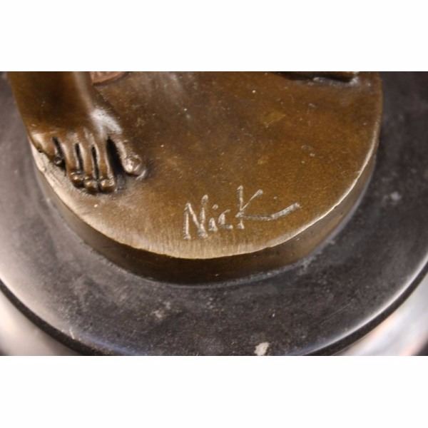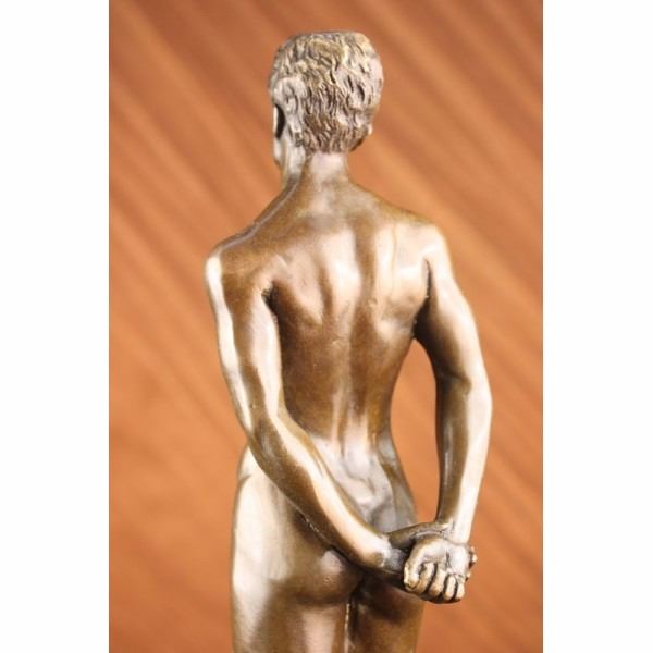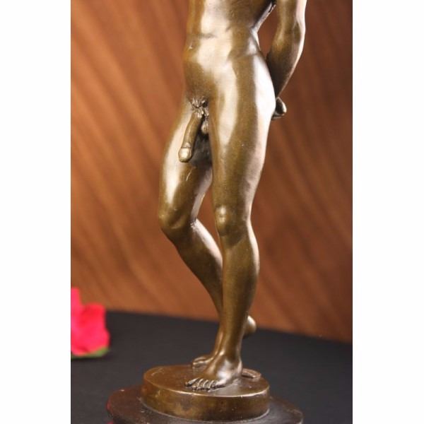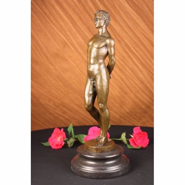 Condition: This sculpture is in a very good condition Inventory. Bronze Dimensions with Marble Base:Height 12" x Width 5"Marble size: Diameter 5" Height without base: 11"Weight :7 LBSInventory : 15ST0053651 He boldly stands in the buff with a look of fearless determination.This proud gay man exposes his manly erection, proving he knows no shame. Just one example of his gorgeous body. He is lean and muscular. Take a gander at his chiseled torso and chest. He would be right at home at New York's Chippendale's and would drive all the guys and dolls mad with desire. This confident stud was cast using the "Lost Wax Method". 100% handmade bronze andcarefully detailed this is a pricless unlimited edition piece of work and is signed by artist Nick. Mario Nick is a very talented young artist who works diligently with our foundry. He was born in 1974 to a wholesome Italian family. He started drawing at a young age and as the years went by he began studying art and working with sculpting. He moved to France to find a better understanding of art and studied there as well. After France he moved to Spain and was discovered by our foundry European Bronze he has partnered and works exclusively with our finery. Condition: This sculpture is in a very good condition Inventory. Bronze Dimensions with Marble Base:Height 12" x Width 5"Marble size: Diameter 5" Height without base: 11"Weight : 7 LBSInventory : 15ST0053651He boldly stands in the buff with a look of fearless determination.This proud gay man exposes his manly erection, prov