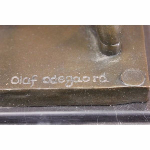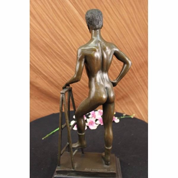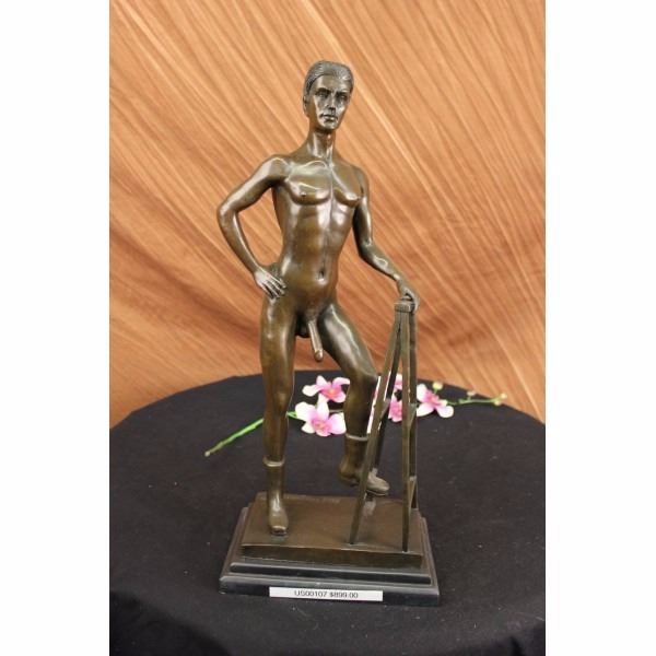Condition: This sculpture is in very good condition. Bronze Dimensions with Marble Base:Height 21" x Width 9 1/2"Marble Dimensions: 9 x 5 1/2".Height without base: 20" Weight : 18 LBSInventory 96US0017069 Symbol of masculinity and confidence, this construction worker isnot shy about his body as he works in the buff. He shows off all ofhis assets, wearing nothing but his workman boots. He comes to rest,with one leg up on his ladder, ready for a long days work. Cast usingthe "Lost Wax Method", this is an Original,100% bronze sculpture is in a brown patina, carefully detailed and handmade. Signed by the artist Olaf Odegaard.Olaf Odegaard (1938-1997) was born a man with two talents, one for the theatre and one for art. From a very young age he pursued both of these arts.He got his start drawing in kindergarten and had moved on to working with oils by the fifth grade. By that time he had his first exhibition. When he reached puberty he became entranced by his growing sexuality and drew hundreds of drawings of his own erect genitals and so began his new artistic venture. He praisesd the beauty of masculine men, their grace, passion of their sexuality, raw power, gentle kindness and love between men. Condition: This sculpture is in very good condition. Bronze Dimensions with Marble Base:Height 21" x Width 9 1/2"Marble Dimensions: 9 x 5 1/2".Height without base: 20" Weight : 18 LBSInventory 96US0017069 Symbol of masculinity and confidence, this construction worker isnot shy about his body as he works in the buff. He sho