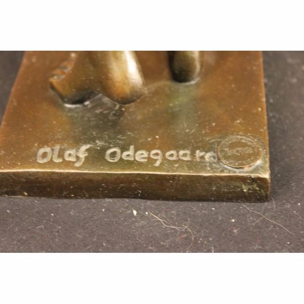 Condition: This sculpture is in a very good condition. Bronze Dimensions with Marble Base:Height 20" x Width 6"Marble Dimensions:5 x 6".Height without base: 19" Weight : 13 LBSInventory82US0036628He boldly stands in the buff with a look of fearless determination. He folds his buff arms across his chiseled chest. Just one example of hisgorgeous body. Take a long gaze of his entire body and see what great shape he is in. He would be right at home at New York's Chippendale's. This confident stud was cast using the "Lost Wax Method" and is in a white patina and signed by artist Olaf Odegaard. This sculpture is 100% handmade bronze and carefully detailed.Olaf Odegaard (1938-1997) was born a man with two talents, one for the theatre and one for art. From a very young age he pursued both of these arts.He got his start drawing in kindergarten and had moved on to working with oils by the fifth grade. By that time he had his first exhibition. When he reached puberty he became entranced by his growing sexuality and drew hundreds of drawings of his own erect genitals and so began his new artistic venture. He praisesd the beauty of masculine men, their grace, passion of their sexuality, raw power, gentle kindness and love between men. Condition: This sculpture is in a very good condition. Bronze Dimensions with Marble Base:Height 20" x Width 6"Marble Dimensions: 5 x 6".Height without base: 19" Weight : 13 LBSInventory 82US0036628 He boldly stands in the buff with a look of fearless determination. He folds his buff arms across his chiseled ches
