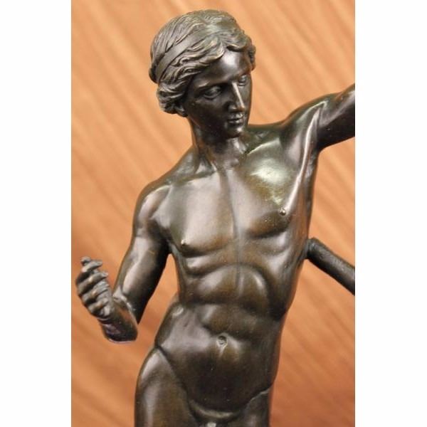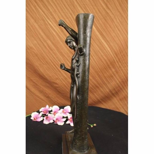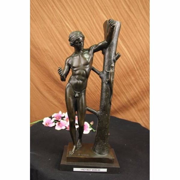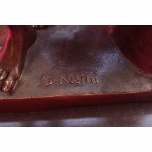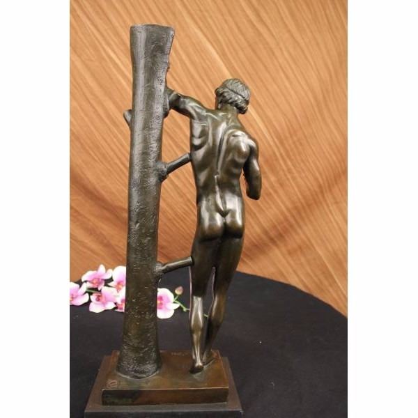 The nude male walks freely in a wooded garden when he comes across a lizard climbing up a tree. His curiosity takes over him as he stops, resting his left forearm on the tree, to watch the lizard taking himself up to the treetop. The handmade bronze sculpture was molded using the early method of lost-wax casting and stained with a brown patina finish for preservation. It is mounted upon a black marble base with the artist G.Nisini's signature. Condition: This sculpture is in perfect condition. Bronze Dimensions with Marble Base:Height 21" x Width 9" Marble Dimensions: 8" X 5". Height without base: 20" Weight : 18 LBS Inventory:44Y1967244