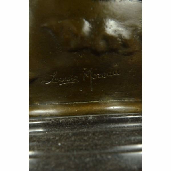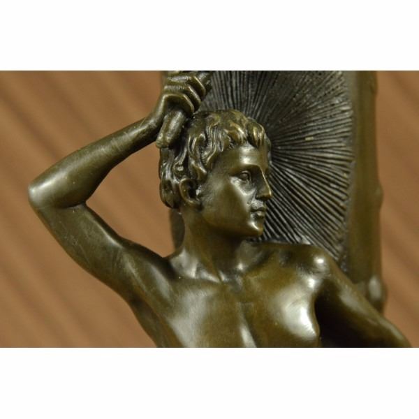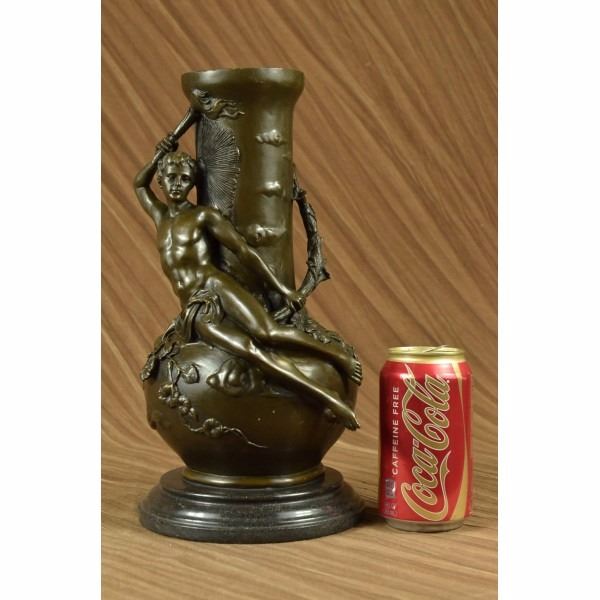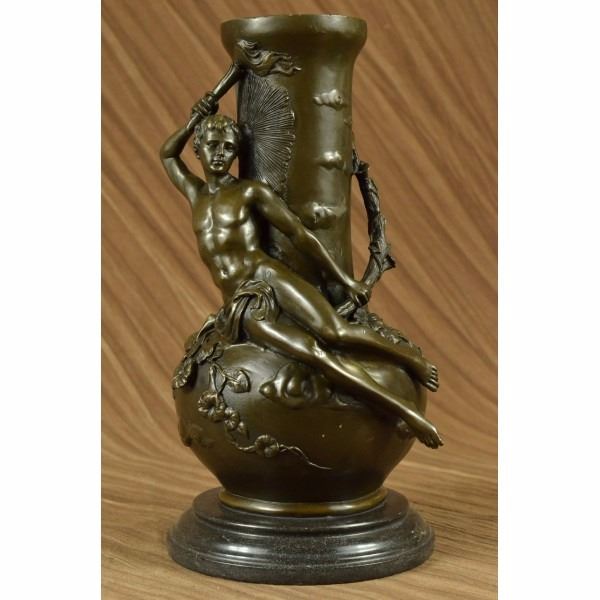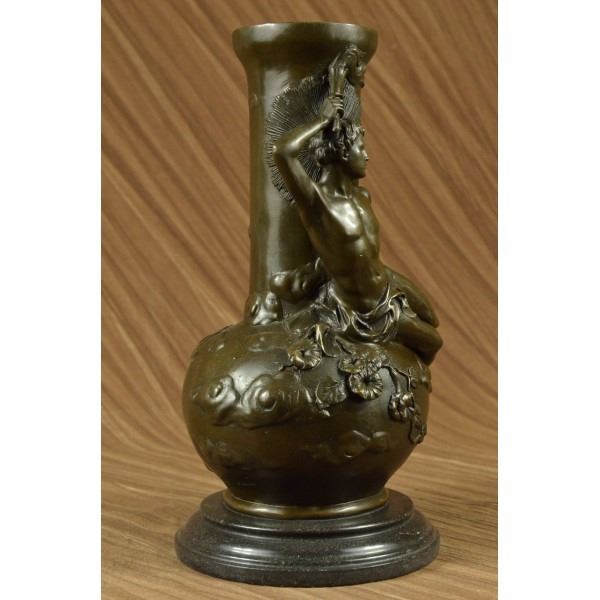 This gorgeous bronze vase shows a man lying in a relaxed mood carrying torch above his head as flowers surround him. His privates are coved with a flowing robe which wraps around him and the vase. He is "Dawn", he holds a torch above his head leadin the way for the sun to follow. Be hind himt he sun follows you can see the rays of the sun beam behind his head. Small clouds float all over the vase and add to the simplicity of this piece. The flowers have great intricate detail adding to the dimension of this sculpture. He has great proportion and his muscles are magnificent. This is the perfect gift to give to that of a flower lover. This sculpture was cast using the "Lost Wax Method" and is handmade. This vase is signed Moreau. Auguste Louis Marthurin Moreau French, 1834-1917 Auguste Louis Marthurin Moreau was born in Dijon, Paris on April 23 1855, the youngest son of sculptor and painter Jean-Baptiste Moreau. He studied with his father and also under Aim Millet, Augustin Drumont and Jean Thomas. Each of the three Moreau brothers - Hippolyte, Marthurin and Auguste - have become renowned for the quality and the beauty of their figurative sculpture. Auguste Moreau worked as a sculptor and specialized in figures, statuettes and groups, mainly in marble. He made his debut at the 1861 Salon in Paris and continued to play an active part in the Salon des Artistes Francais as a member of the Societe des Artistes Francais until 1910. Condition: This sculpture is in a very good condition. Bronze Dimensions with Marble Base:Height 13" x Width 8" Marble Dimensions: diameter 5". Height without base: 11" Weight : 15 LBS Inventory; 5262B67225