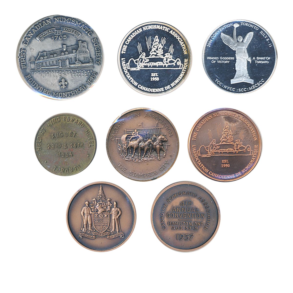 Canadian Numismatic Association. 1954. Brass Restrike. Toronto. CNA-1D; 1957. Bronze. Hamilton. CNA-4A; 1965. Silver. Montreal. CNA-12C; 1968. Bronze. Calgary. CNA-15A; 2004. Silver. Toronto. CNA-51a; 2005. Silver & Bronze. Calgary. CNA-52A & 52B. Lot of eight (8) medals, all AU-Proof. Charlton Cat. of Can. Numis. Medals (2008) value of $295.00.