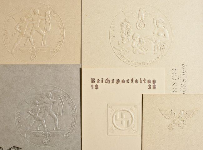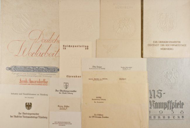 Excellent grouping of 15 printing samples produced by printer Leonhard Amersdorffer in Nuremberg for German administrators. The printer excelled in embossing, and most items bear large embossments which may not exist elsewhere. Samples include items prepared for the mayor, Reichs Party Day 1938 and 1939, letterheads for members of the S.A. and political leaders, etc. Nuremberg Rally 1939 named the "Rally of Peace" was cancelled at short notice when one day before the planned opening, Germany invaded Poland. Overall fine.